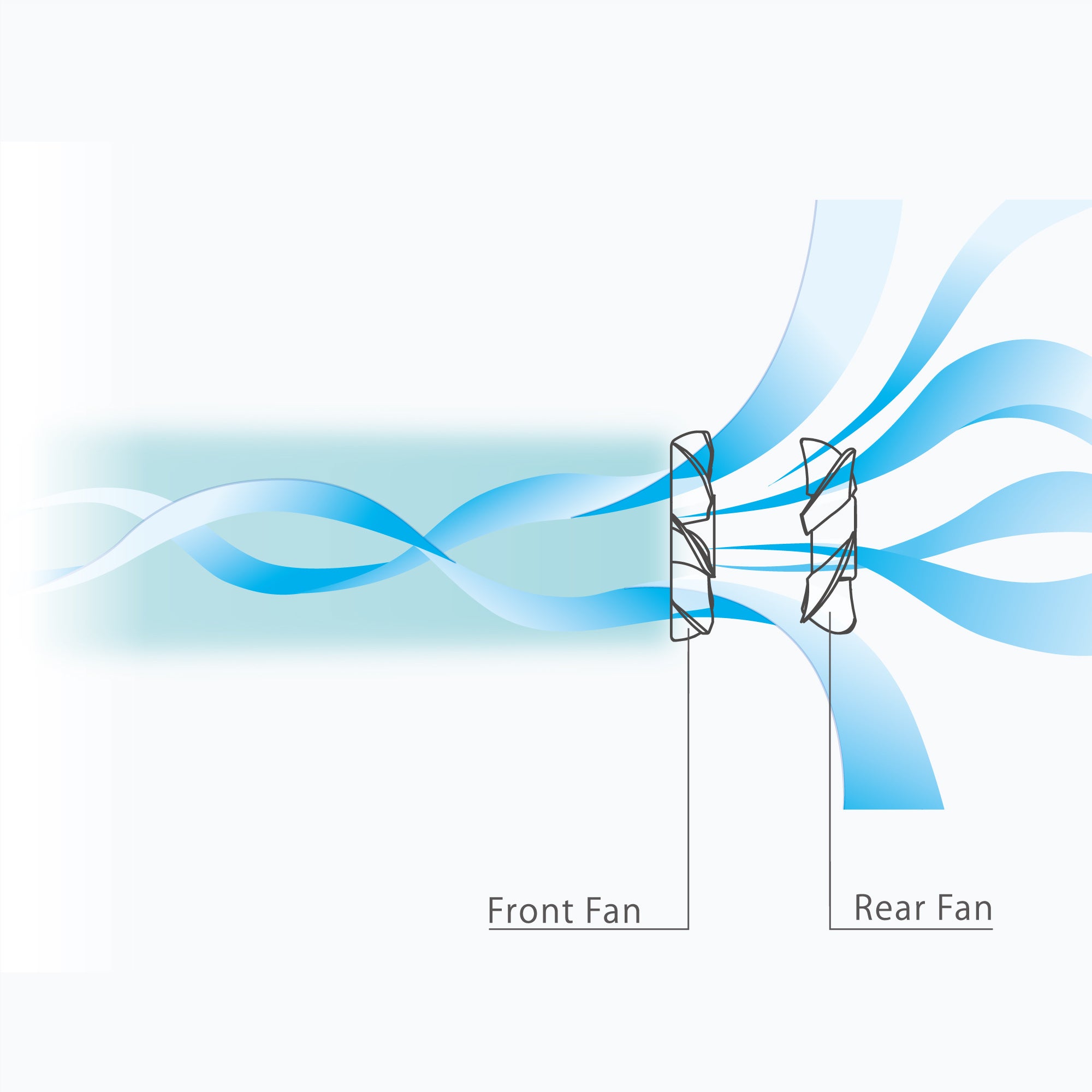 後ろのファンで空気を集め、前のファンで筒状の風を届けます。