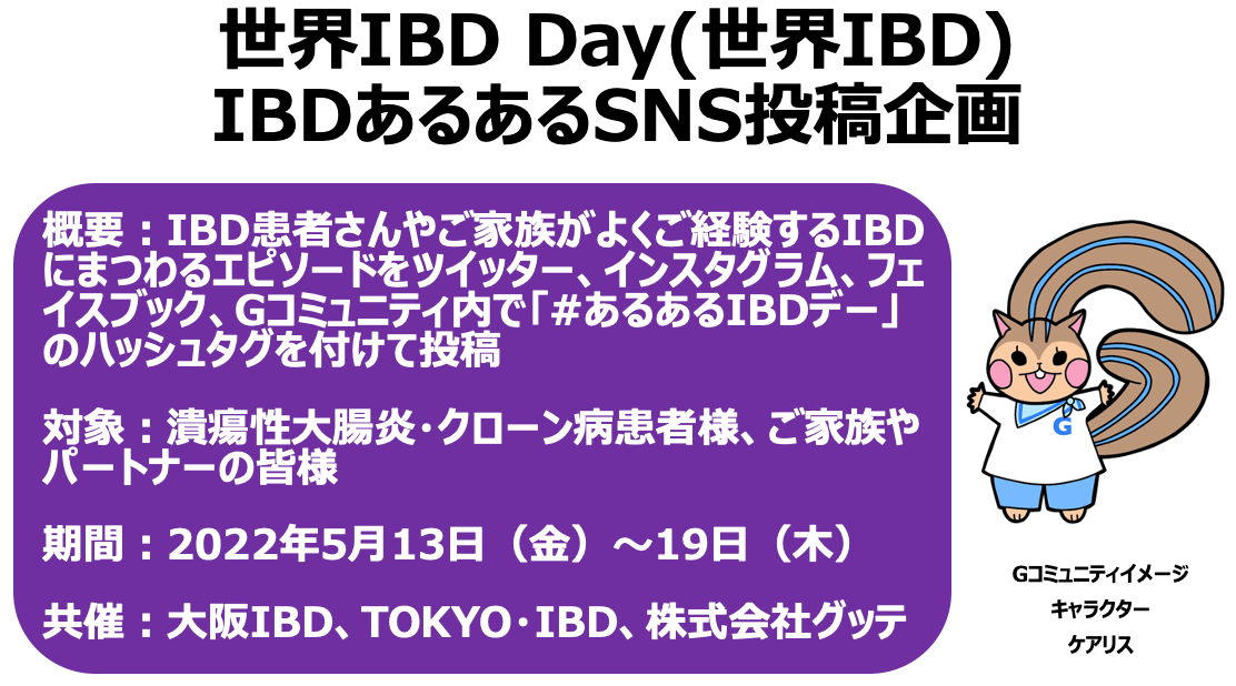 潰瘍性大腸炎・クローン病等の炎症性腸疾患(Inflammatory Bowel Disease:IBD)オンライン患者コミュニティ「Gコミュニティ」を運営する株式会社グッテ(所在地:東京都千代田区、代表取締役:宮﨑拓郎、以下「グッテ」、旧名:株式会社ジーケア)は大阪府で活動を行っているIBD患者会「大阪IBD」、東京都で活動を行っているIBD患者会「TOKYO・IBD」とともに世界IBDデー(IBDを理解する日)に合わせて、IBD患者さんやご家族がよくご経験されるIBDにまつわるエピソードをSNSで発信する「IBDあるあるSNS投稿企画」を開催することをお知らせいたします。