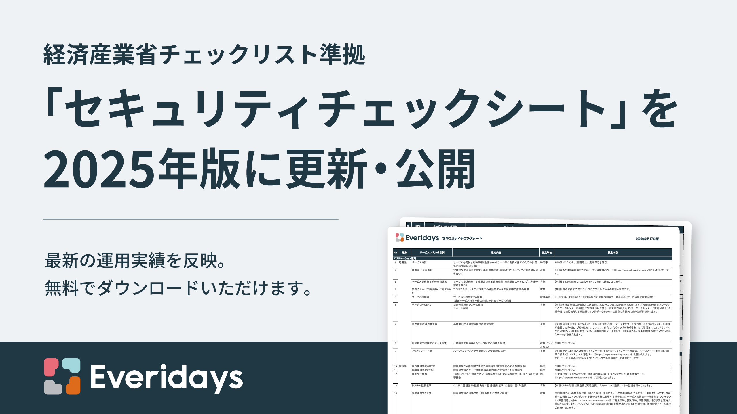 Everidaysでは2023年1月より、経済産業省「クラウドサービスレベルのチェックリスト」に基づいたセキュリティチェックシートを公開してまいりました。このたび、2025年の運用実績を反映し、各項目の回答内容を最新の情報に更新しました。