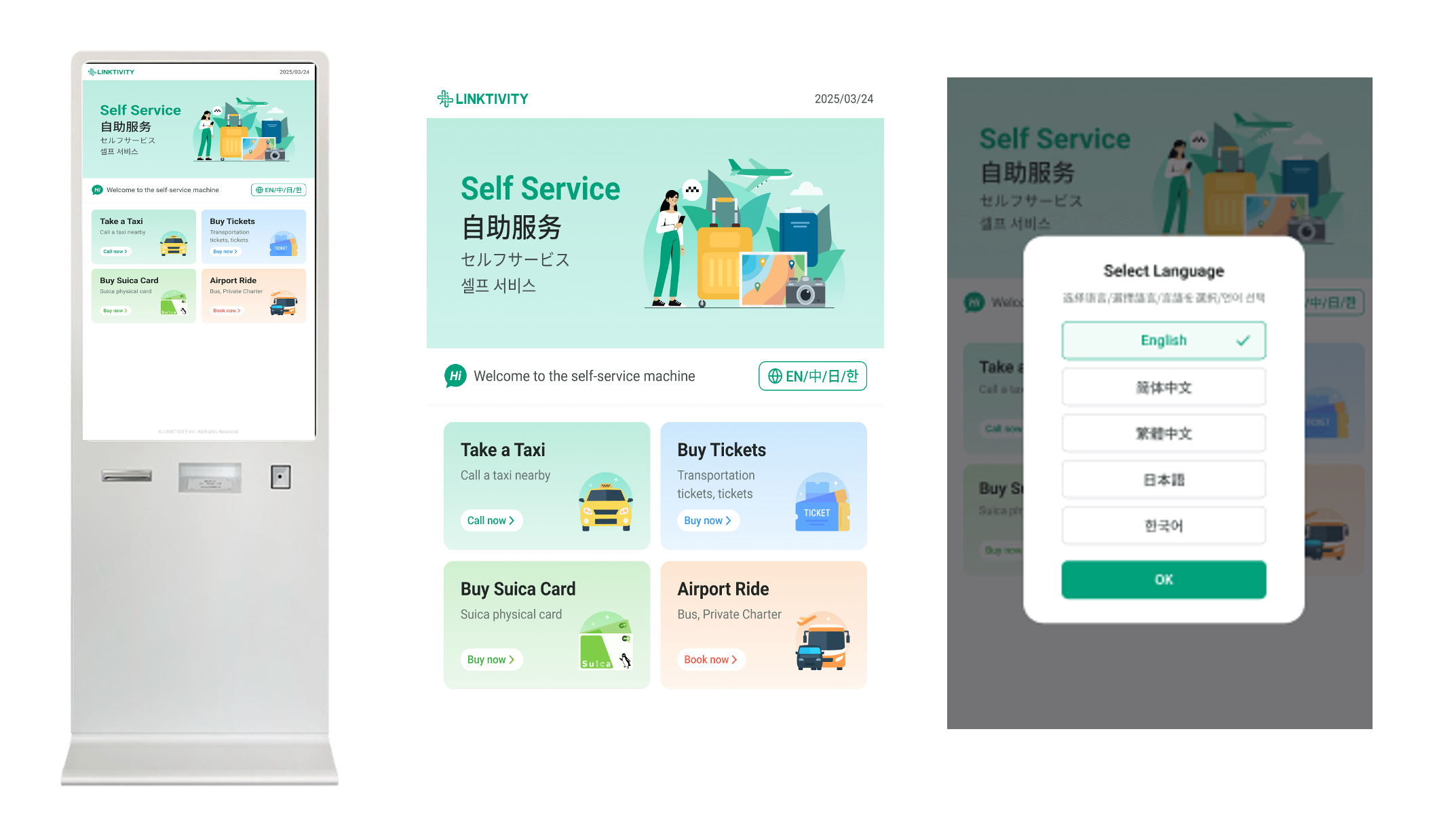 TriplaboKioskは、タクシー手配に留まらず、宿泊者の様々なニーズに応える機能を搭載しています。いずれの機能も中国語(簡体・繁体)・英語・韓国語・日本語の5言語に対応したタッチパネルで操作を行い、追加アプリのダウンロードなしで、誰もが直感的に操作できます。