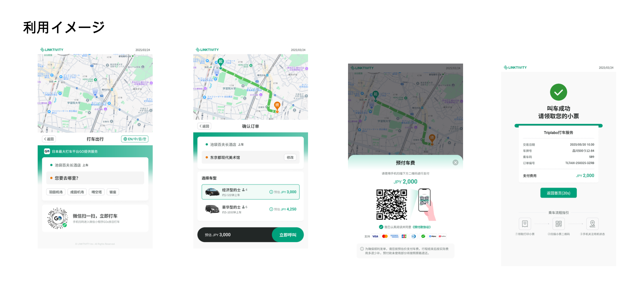 宿泊者は、中国語(簡体字・繁体字)・英語・韓国語・日本語に対応したTriplabo Kioskの画面を操作するだけで、簡単にタクシーを呼ぶことができます。リアルタイムで車両の位置を確認できるほか、クレジットカードや主要なQRコード決済にも対応しており、「言語の壁なし、支払いの手間なし、直感的な使い心地」によるスマートな移動体験を提供します。