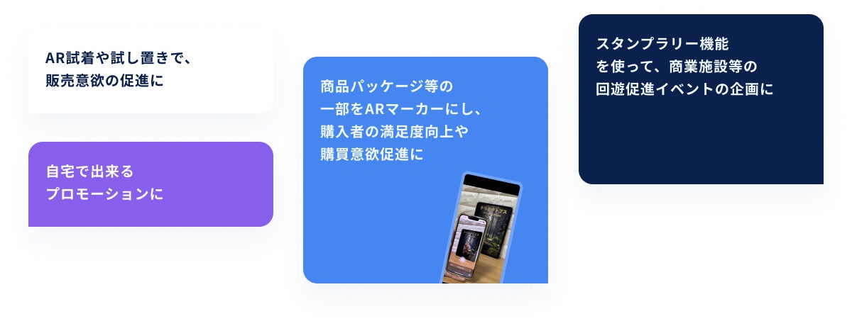 ARが持つ特性を最大限活用し、テキストや画像、動画で は表現しきれない印象的なプロモーションや、魅力ある試着体験 を提供します。