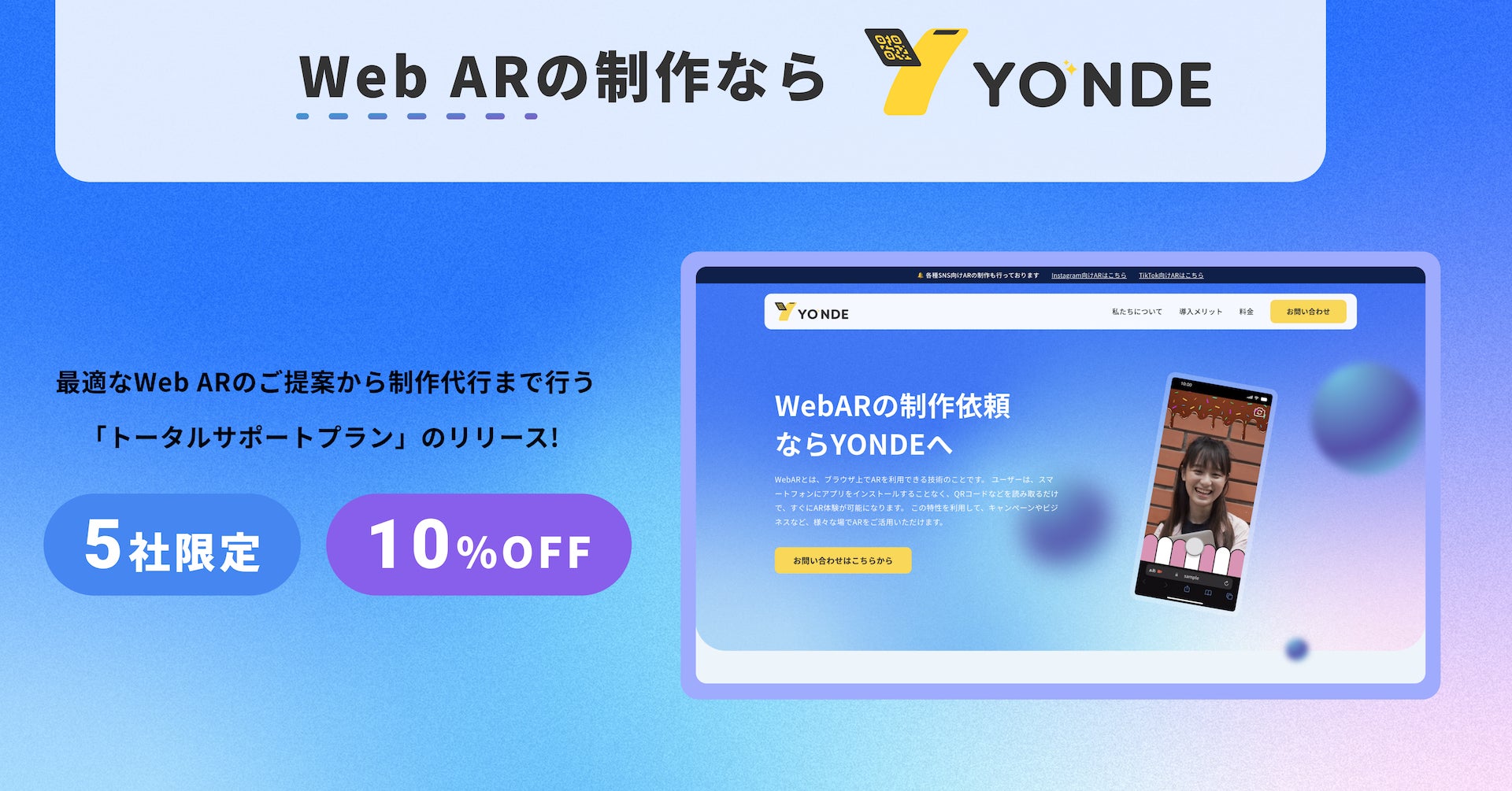 株式会社YONDE(本社:福岡市中央区、代表取締役:田坂 洋一)は、Web ARツールの最適なご提案から制作代行まで「トータルサポートプラン」の提供を、5月18日(木)より開始します。