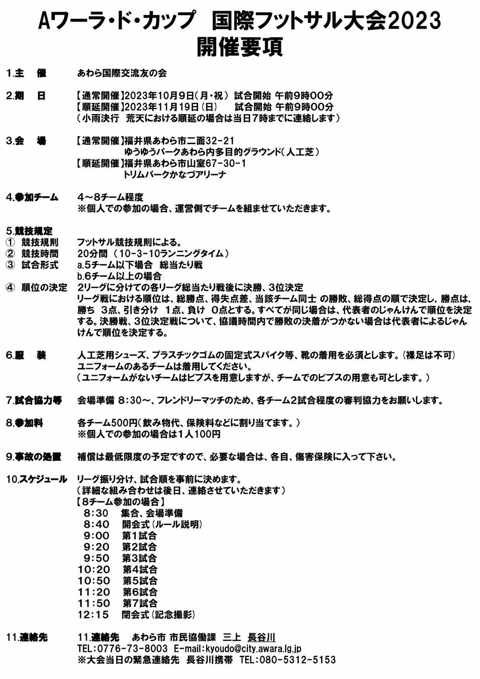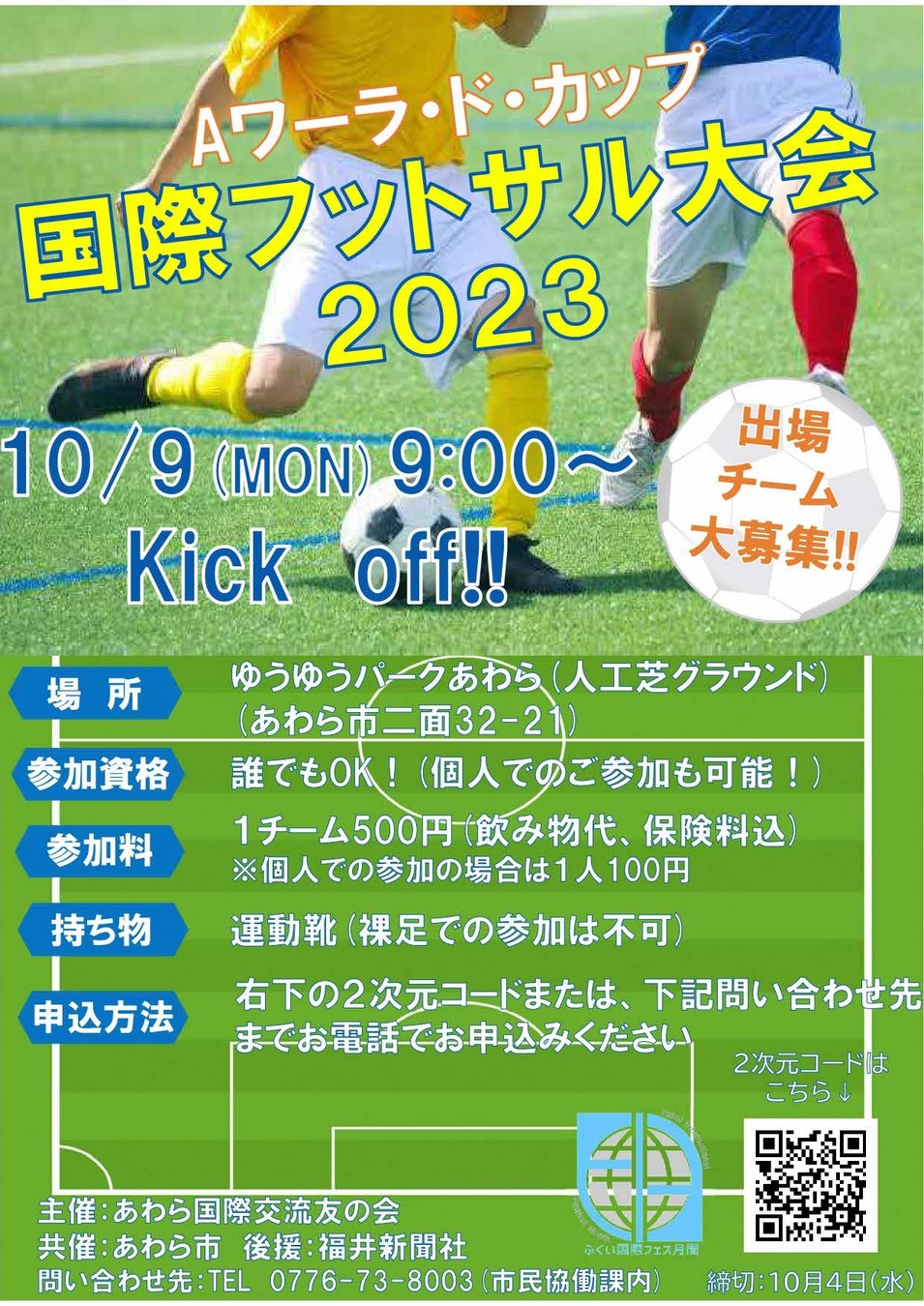 10月9日(月)の「Aワーラ・ド・カップ 国際フットサル大会2023」では、国籍を問わず交流することで、地域住民とのつながりをつくり、あわら市における多文化共生のまちづくりに寄与することを目的としております。