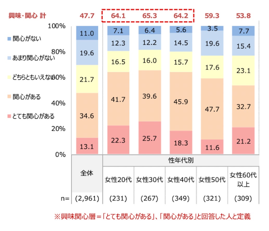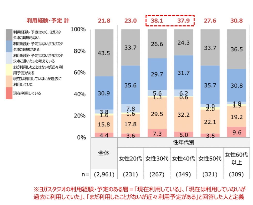 今後もさらに対話型AIの市場は成長し、市場規模は2027年に156億米ドルに到達すると予測されています。成長し続ける市場に対して、ヨクト株式会社でも自社調査を行いました。ヨガに対する興味関心を持つ割合が全体の47.7%に達しました。その中でもヨガスタジオの潜在関心層は34.7%です。すでに利用したことのある層の約1.5倍の厚さがあり、ヨガスタジオは現在市場にいるユーザーよりも広い潜在市場があることがわかります。