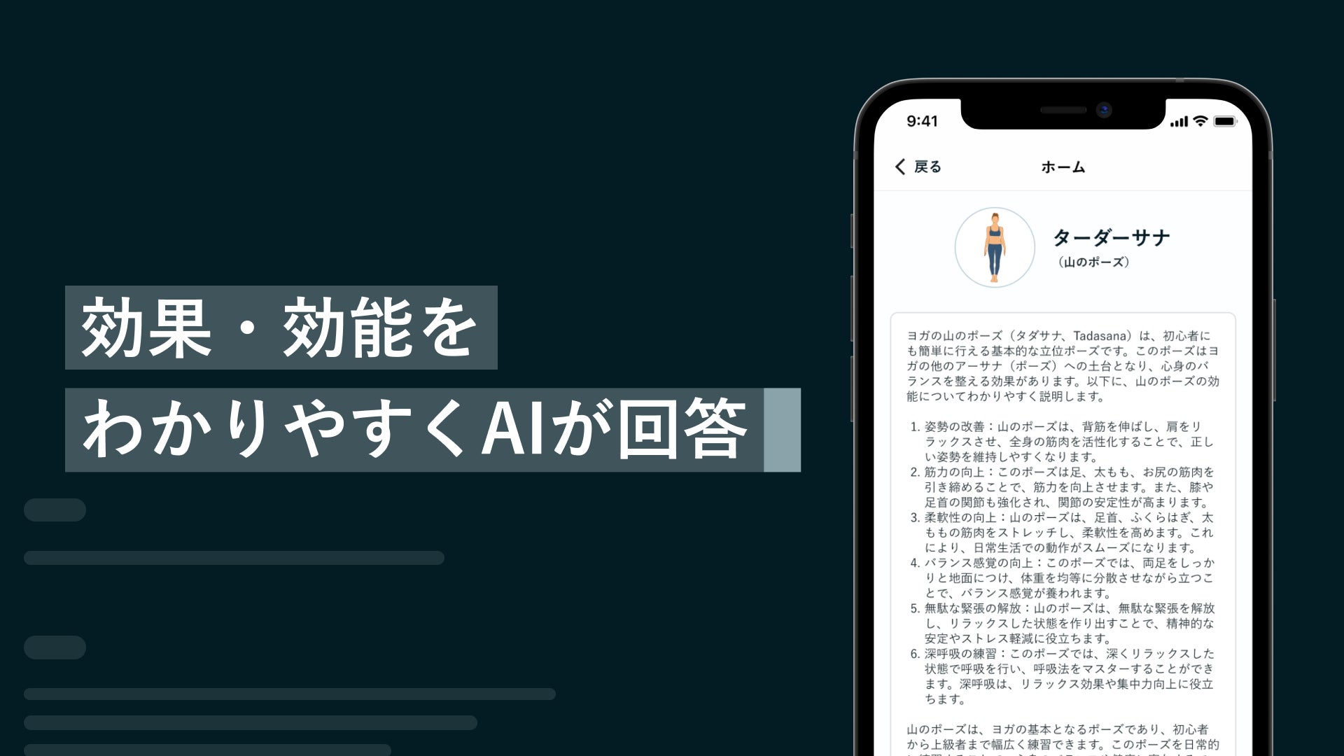 それらのヨガポーズを選択すると各ポーズに関する詳しい説明や手順、どんな効果・効能があるのかをAIが解説してくれます。将来的には、対応するポーズの種類を増やしたり、機能を追加していく予定です。