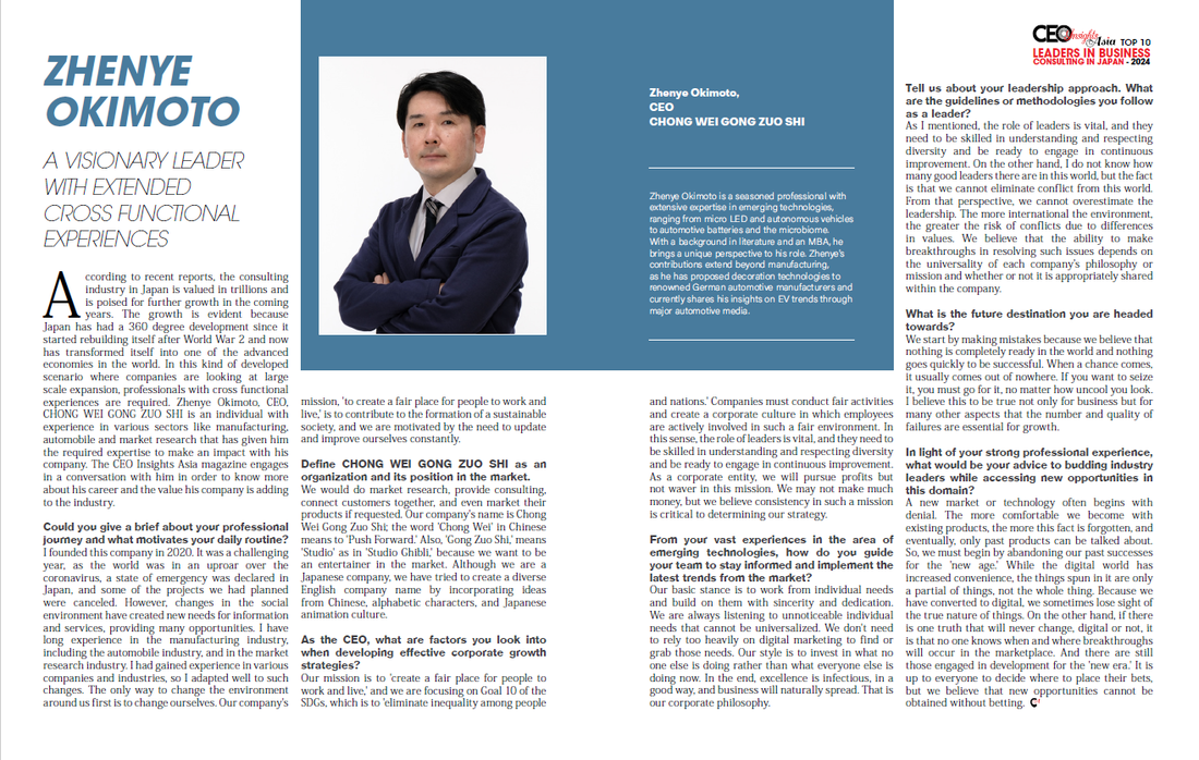 沖為工作室は市場調査・分析を含むマーケットインテリジェンスというフェーズで主にカスタマイズサービスに注力し、経済や政策環境等の動向も踏まえ、先端技術分野の市場調査からの戦略立案、新規事業計画、営業活動、提言・助言まで総合的な情報サービスを提供しています。また国内、海外で多くの講演を行うとともに、主要メディア媒体での執筆活動も精力的に行い、知名度も高めて参りました。2024年には「日本のビジネスコンサルティングにおけるトップ10 リーダー 2024」に選ばれています。