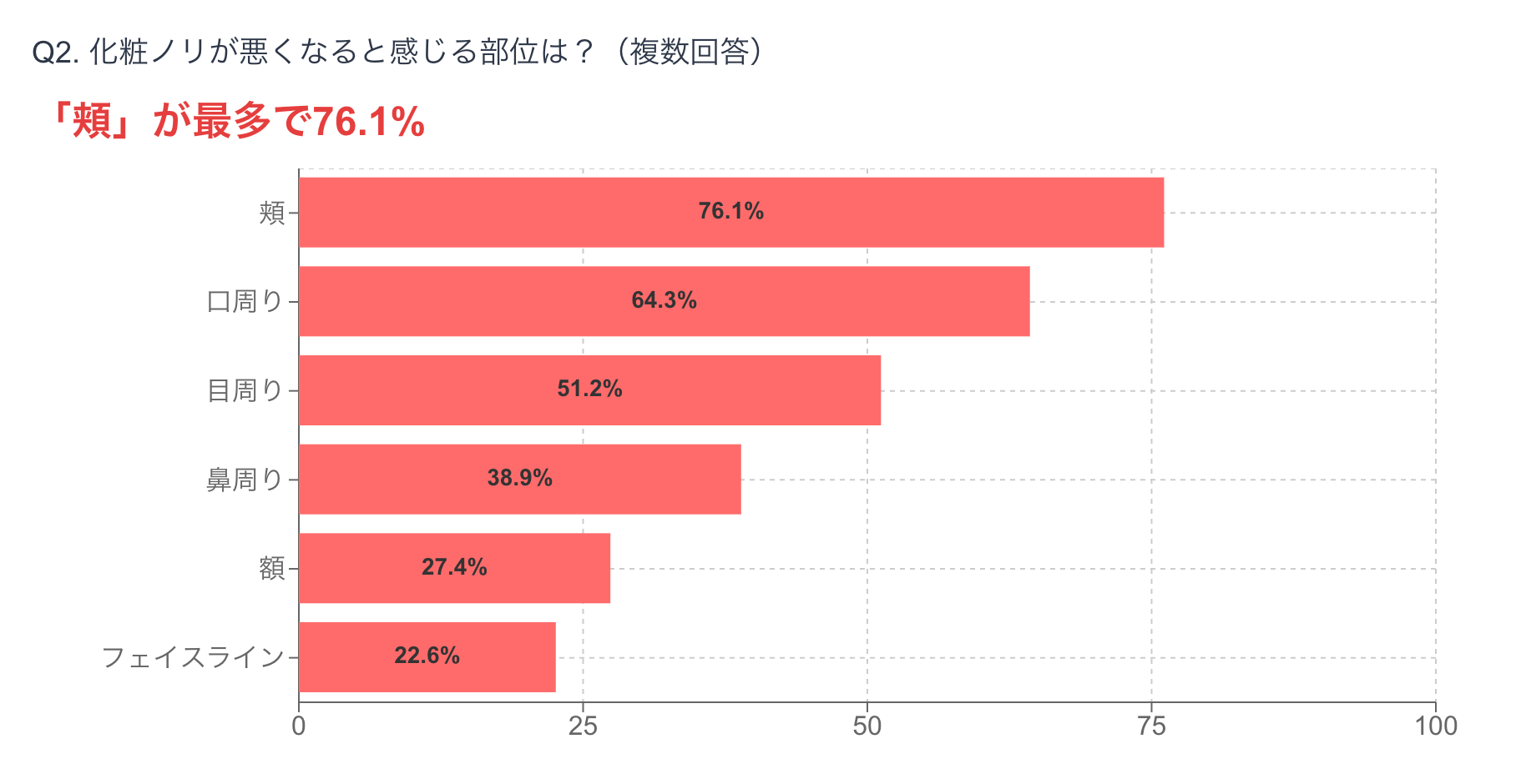 その結果、最も多いのは「頬」で約76%、次いで「口周り」(64%)、「目周り」(51%)という結果になりました。特に乾燥しやすい頬や口周りが、化粧崩れの影響を受けやすいことが明らかになりました。