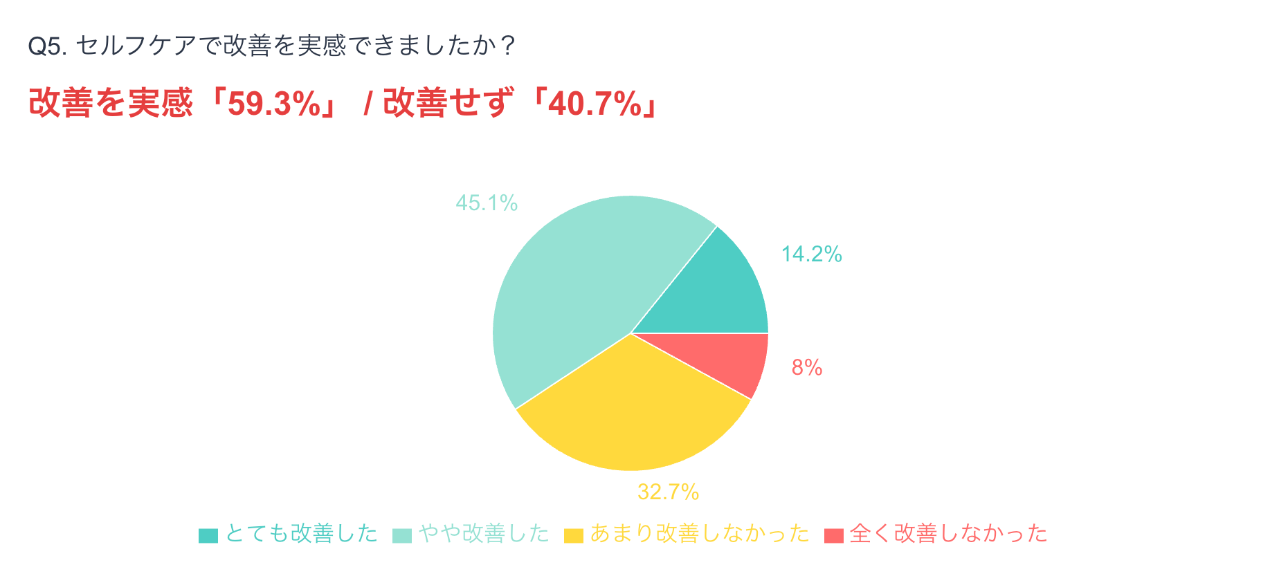 その結果、「改善した」と感じた方は59.3%で、約4割の方はセルフケアだけでは十分な効果を感じられていないことが分かりました。