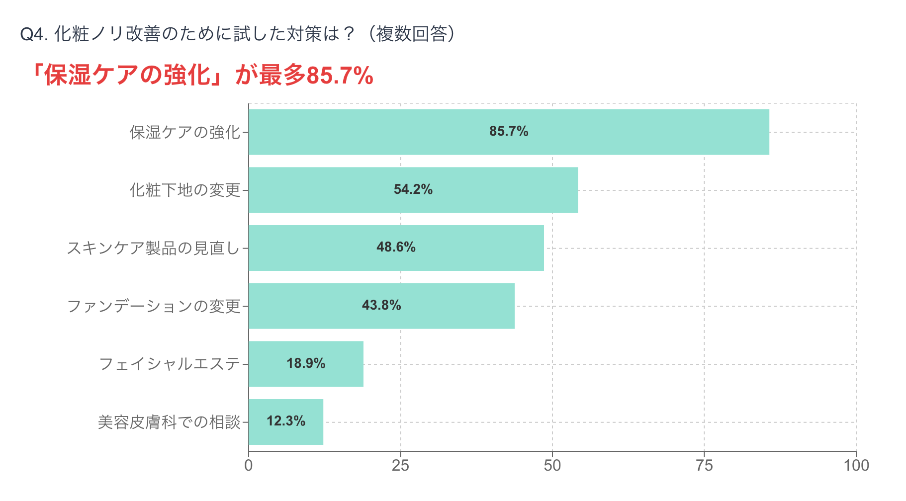 その結果、「保湿ケアの強化」が85.7%で最多、次いで「化粧下地の変更」(54.2%)、「スキンケア製品の見直し」(48.6%)という結果になりました。一方で、「美容皮膚科での治療」を検討した方は12.3%にとどまりました。