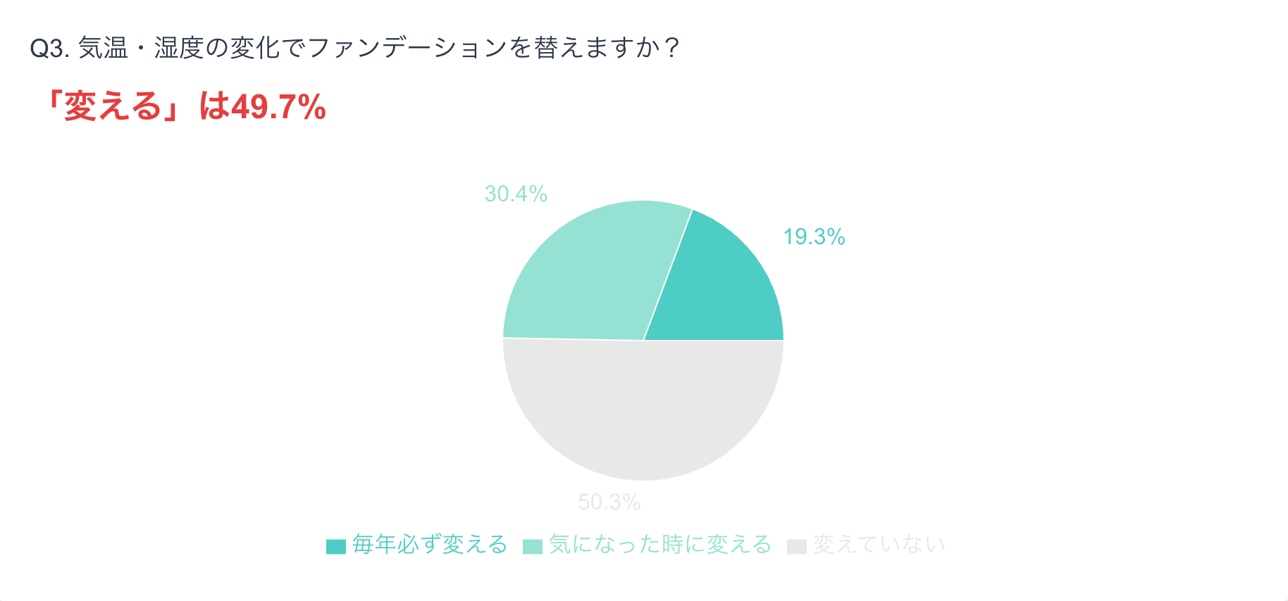 その結果、変えている方は49.7%と約半数にとどまり、半数以上の方が季節に応じたベースメイクの見直しを行っていないことが分かりました。