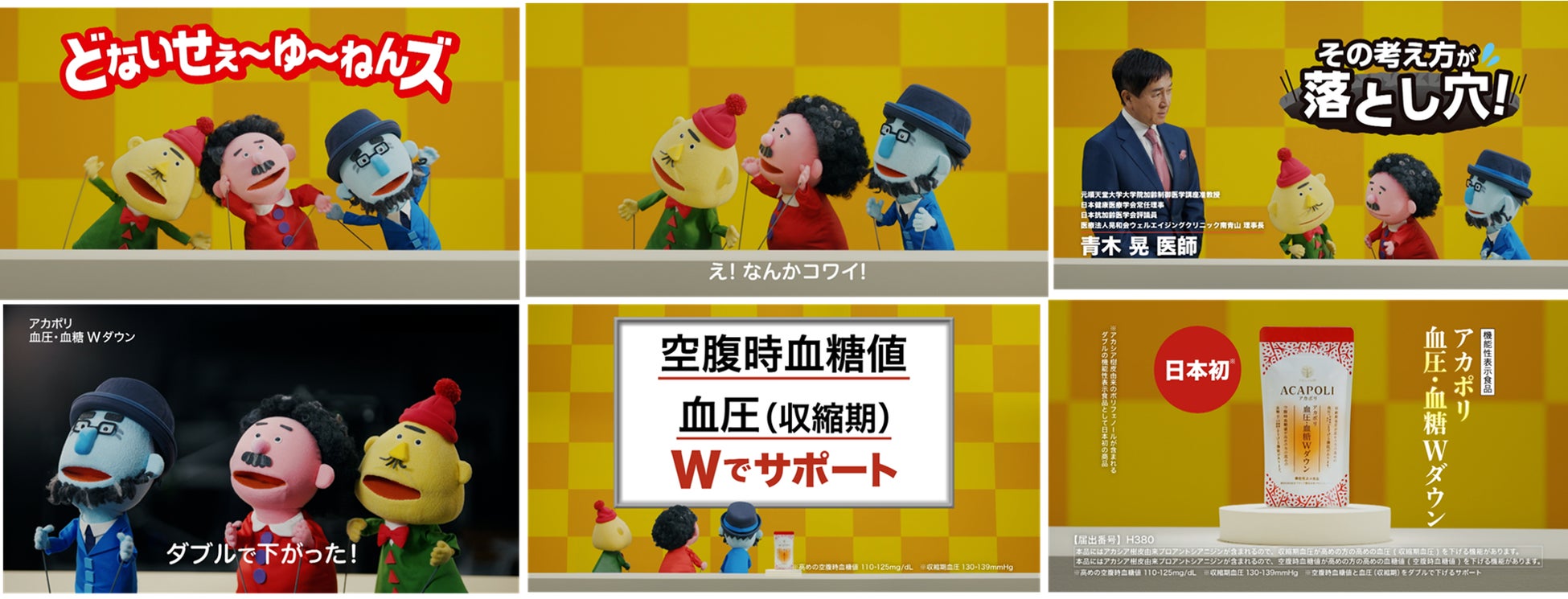 「アカポリ血圧・血糖Wダウン」の商品説明には空腹時血糖値や収縮時血圧、機能性表示食品など難しい単語が多く並びます。今回、私たちは少しでも商品のことを消費者に分かりやすく、キャッチ―な印象で伝わるように工夫を凝らしました。『どないせぇーゆーねんズ編』ではパペットを使った斬新な表現に挑戦しています。