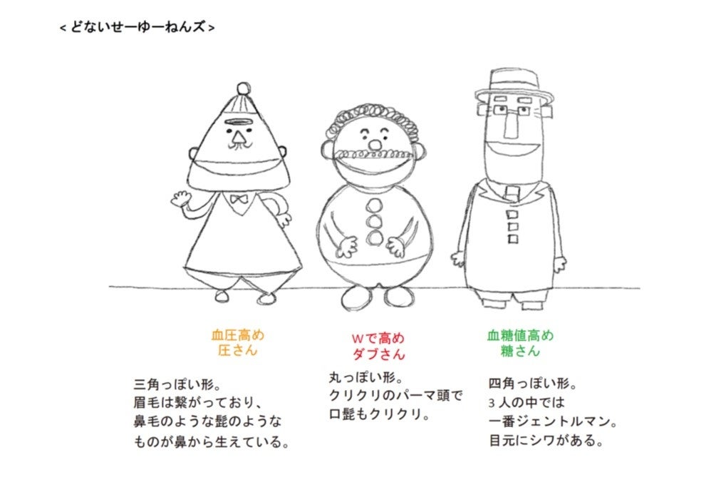 血糖値が高めの "糖さん″、血圧高めの "圧さん″、血圧、血糖両方高めの "ダブさん″というキャラクターを設定。それぞれの悩みには関連があり、同時対策の大切さについて3人が学ぶ様子をコミカルに演出しました。