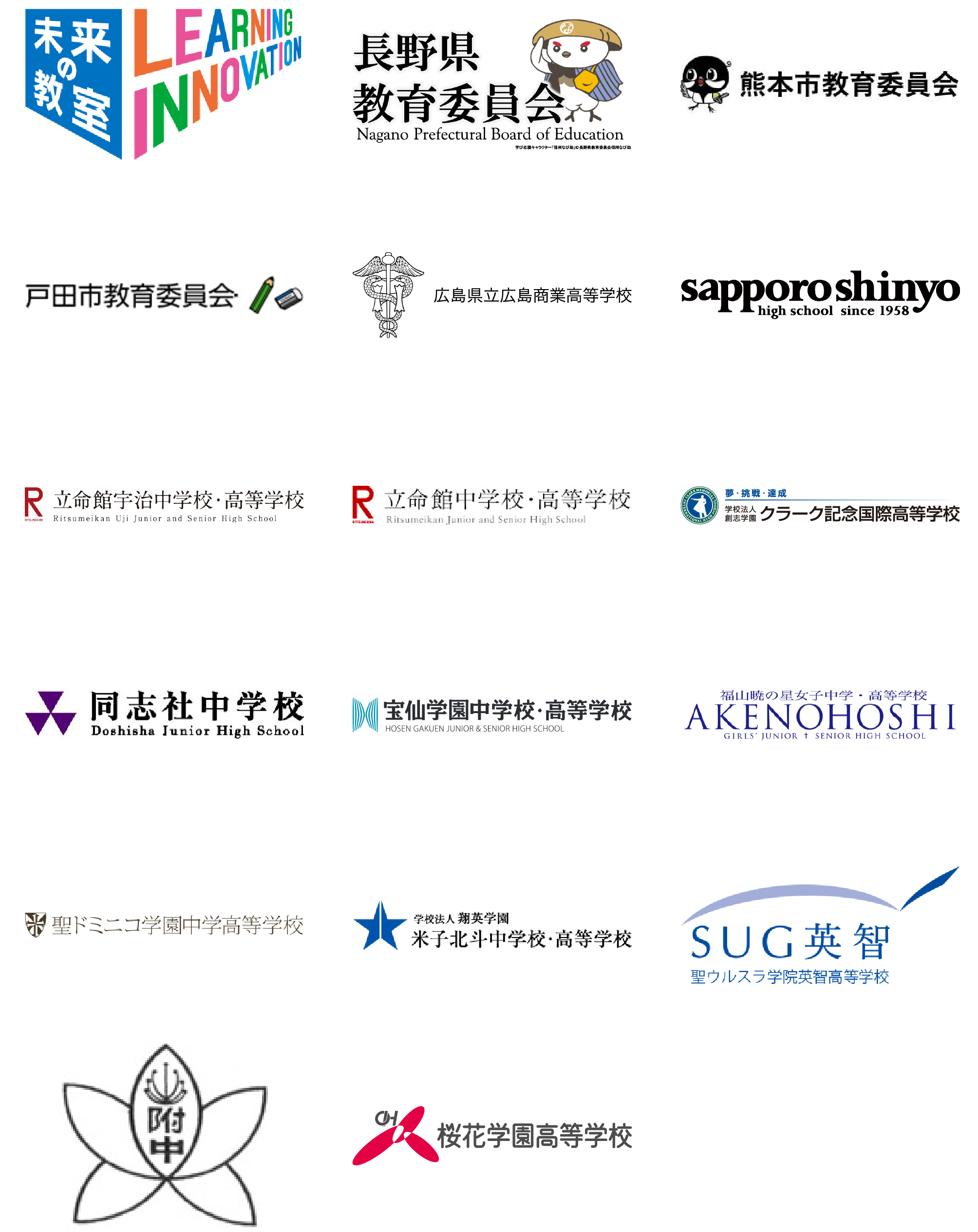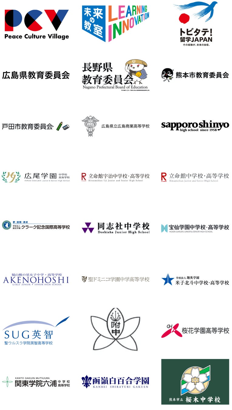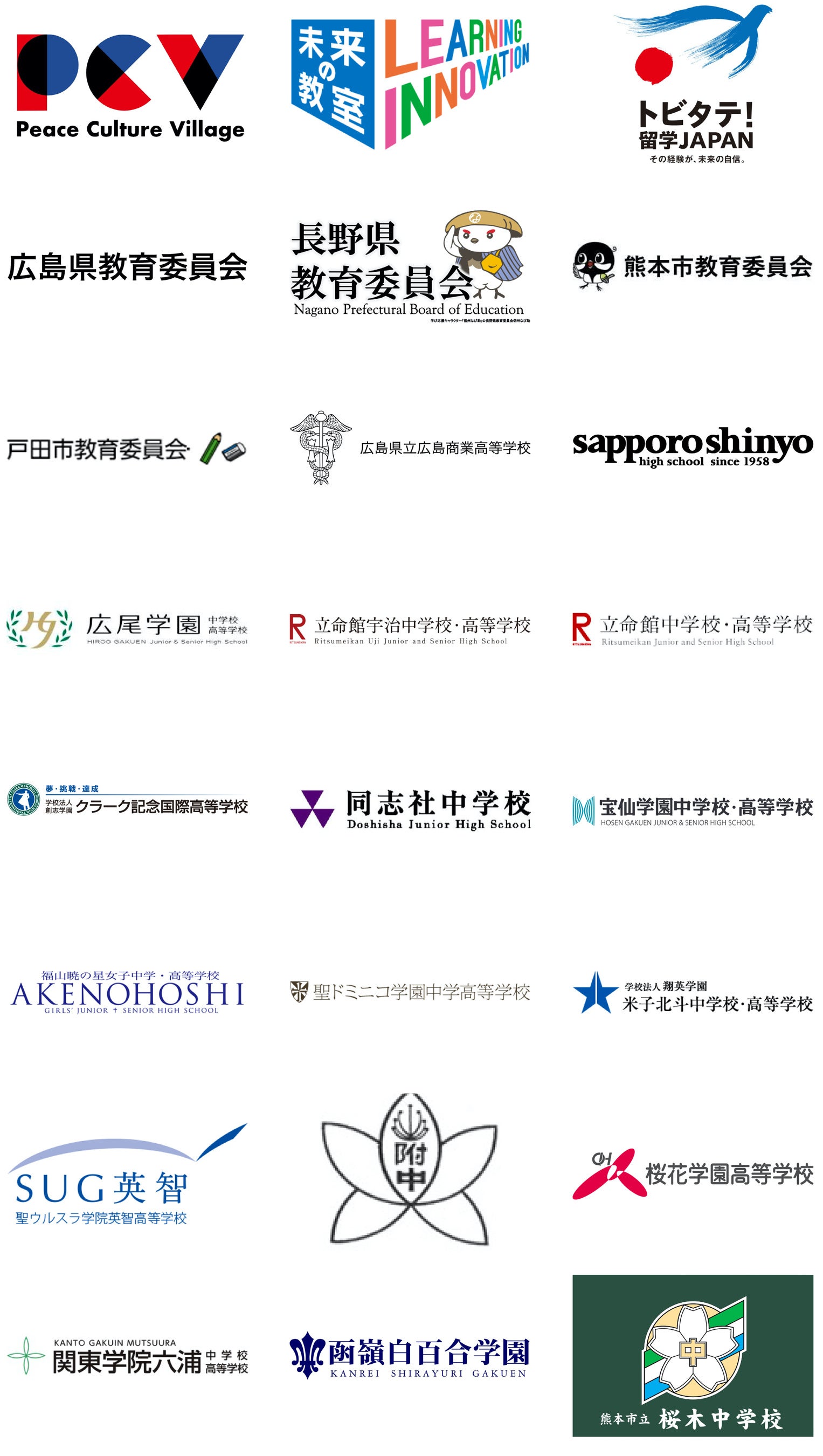 NPO法人 Peace Culture Village、経済産業省 「未来の教室 Learning Innovation」(※1)、トビタテ!留学JAPAN、広島県教育委員会、長野県教育委員会、熊本市教育委員会、戸田市教育委員会、広島県立広島商業高校、札幌新陽高等学校、広尾学園中学校、立命館宇治中学校・高等学校、立命館中学校・高等学校、クラーク記念国際高等学校、同志社中学校、宝仙学園中学校・高等学校、福山暁の星女子中学・高等学校、聖ドミニコ学園中学高等学校、米子北斗中学校・高等学校、聖ウルスラ学院英智高等学校、兵庫教育大学附属中学校、桜花学園高等学校、関東学院六浦中学校・高等学校、函嶺白百合学園中学高等学校、熊本市立桜木中学校