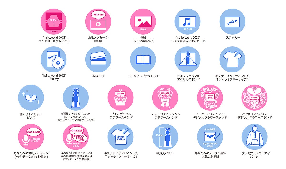 「デジタルフラワースタンド(全4種)」「あなたへのお礼メッセージボイス」「あなたへのお礼メッセージボイス&あなたの質問にお答えボイス」「【あなたへのお名前を入れたデジタルサイン入り】キズナアイがデザインしたTシャツ」「二つ折り等身大パネル」「あなたへのデジタル直筆お礼のお手紙」「プレミアムキズナアイパーカー」