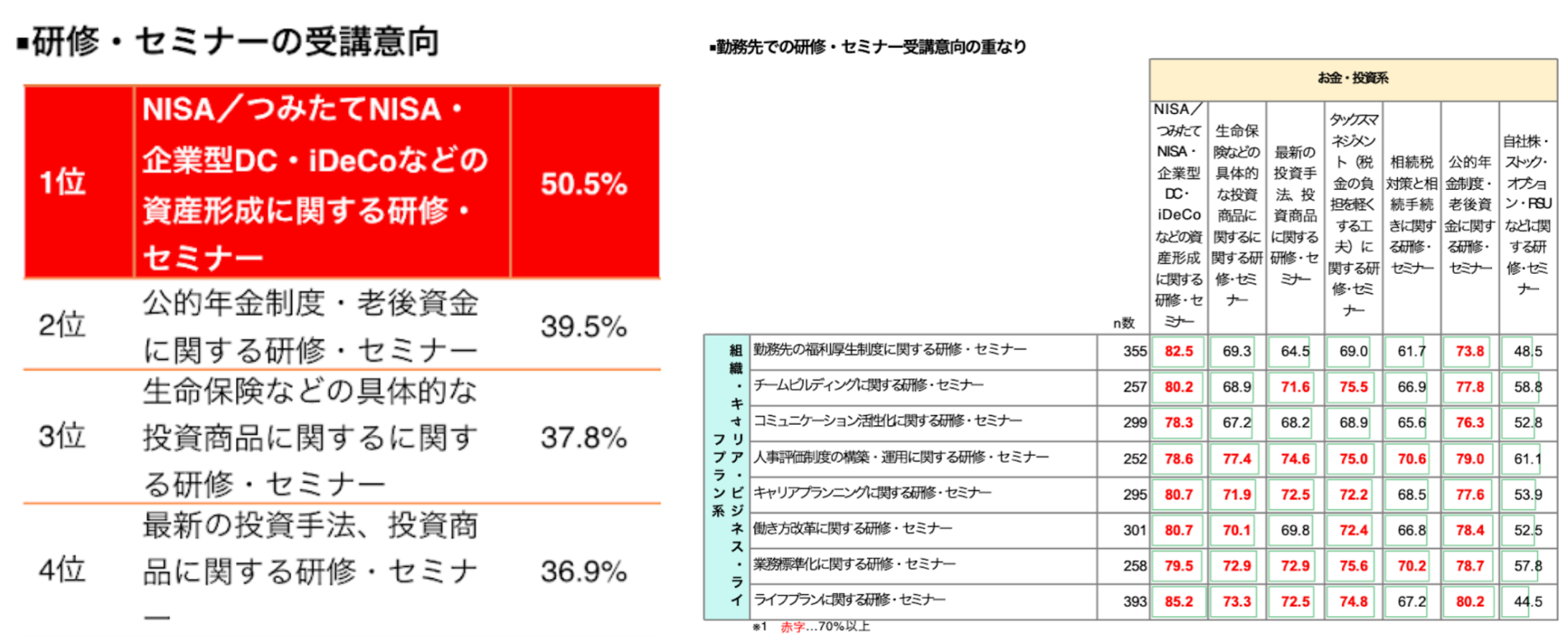 また、企業内での研修の受講率を高めるため、「お金・投資系」と「組織・キャリア・ビジネス・ライフプラン系」の内容を組み合わせるという工夫ができるのではないか。