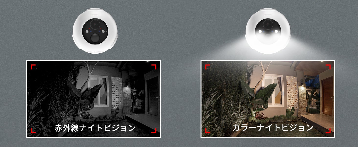 カラーナイトビジョン搭載で、夜間でも昼間と同じようにカラー撮影が可能です。映像はGoogleネストハブやアレクサ・エコーショーでいつでも確認できますので、オフィスや駐車場、倉庫など遠隔での映像確認にも最適です。350lumの高輝度LEDが2つ付いており、不審者を検知するとLEDライトで照射。異常な侵入を感知すると自動的に点灯。さらに110度広角レンズで前傾をしっかり記録するため、画角が広くカメラの直下も確認できます。また、LEDライトの点灯を望まない場合は、赤外線ナイトビジョンに切り替えることで、点灯しないようにできます。
