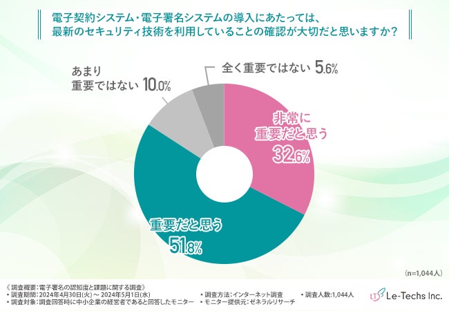 最後に、「電子契約システム・電子署名システムの導入にあたっては、最新のセキュリティ技術を利用していることの確認が大切だと思いますか?」と質問したところ、8割以上の方が『非常に重要だと思う(32.6%)』『重要だと思う(51.8%)』と回答しました。