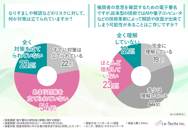 「権限者の意思を確認するための電子署名ですが、従来型の技術ではAIや量子コンピュータなどの技術革新によって解読や改竄が出来てしまう可能性があることはご存じですか?」と質問したところ、『完全に理解している(19.2%)』『多少は理解している(44.9%)』『ほとんど理解していない(23.9%)』『全く理解していない(12.0%)』という回答結果になりました。