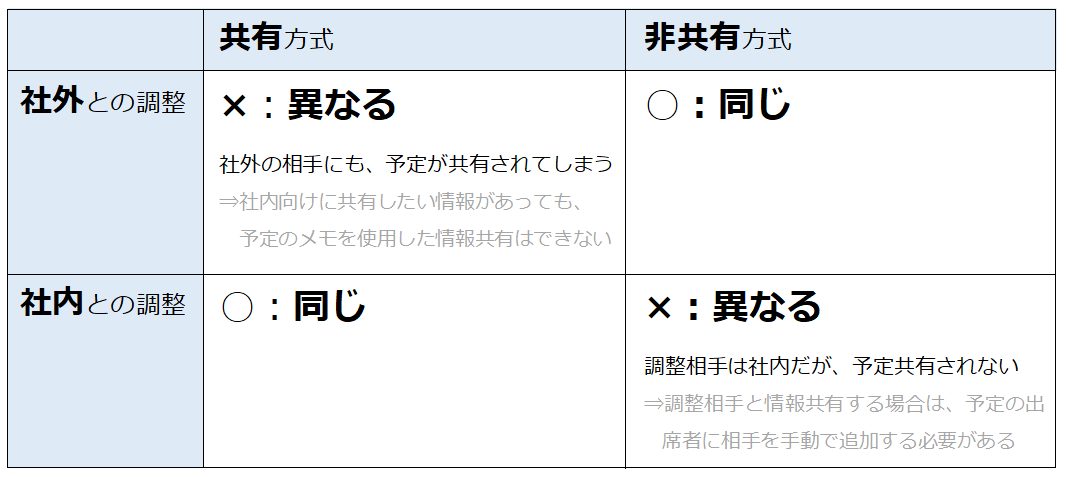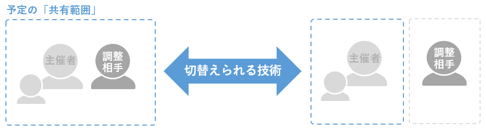 しかし、各日程調整ツールが採用している予定の登録方式は、以下「共有方式/非共有方式」のいずれか一方であるため、どちらの方式であっても、各日程調整ツールが自動登録する予定の共有範囲は上述の「一般的な予定共有」と完全に一致することはありません。つまり、日程調整ツールで日程調整した場合、ある場面においては必ず、使い勝手の悪い「予定の共有状態」になってしまうのが実状です。