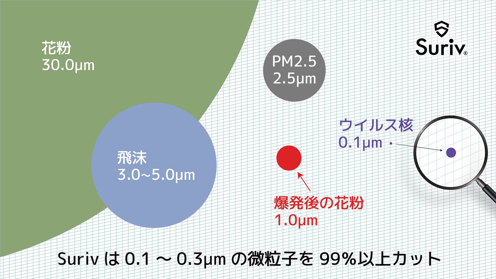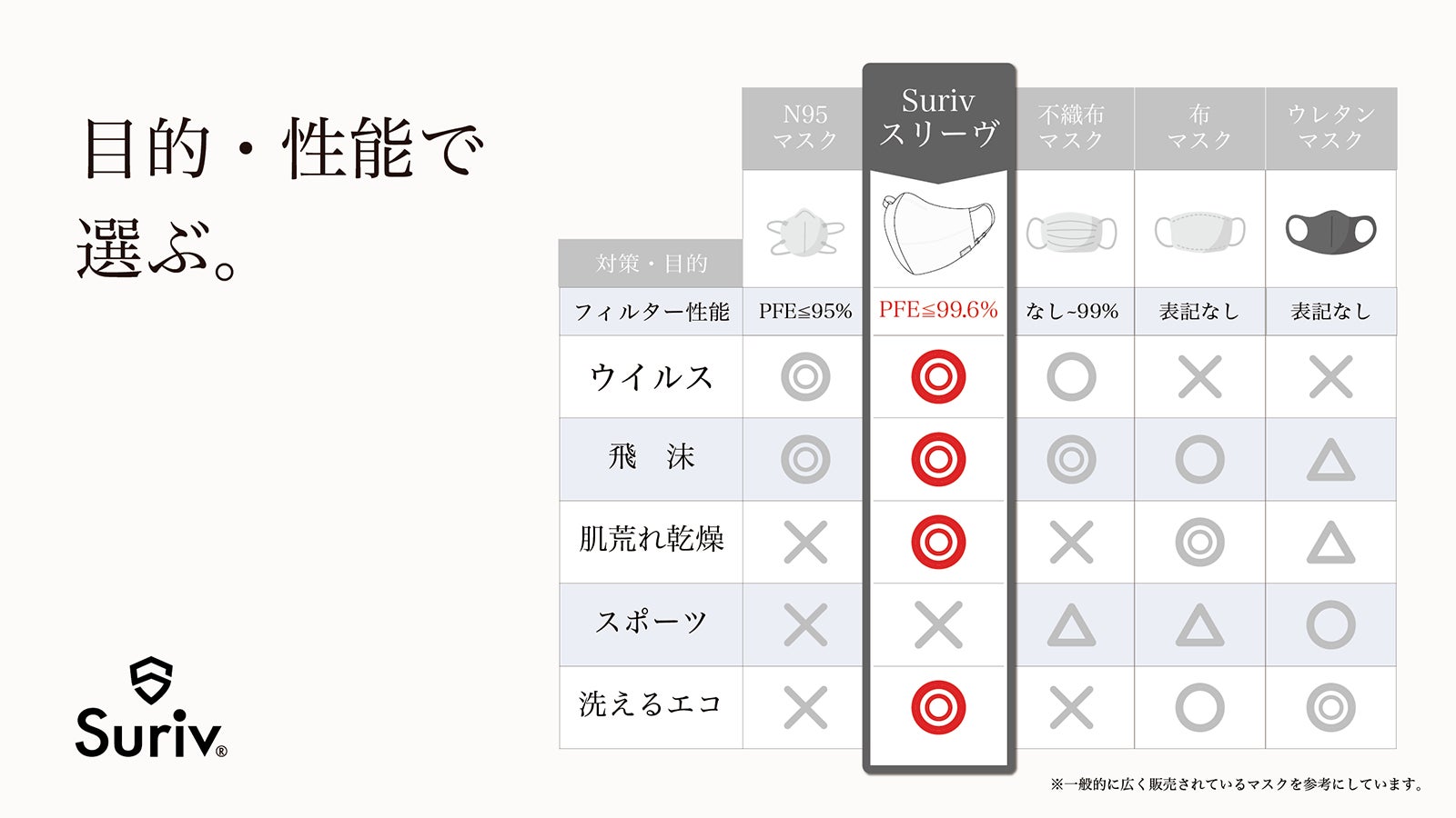 Surivマスクは、高いろ過性能をもつ特殊なフィルターを採用し、黄砂はもちろんPM2.5や花粉、さらにウイルスなどの微粒子もしっかりキャッチ。加えて、になっています。マスクを着用することで、このような微粒子化した物質の侵入を防ぎ、健康を守ることができるとされています。
