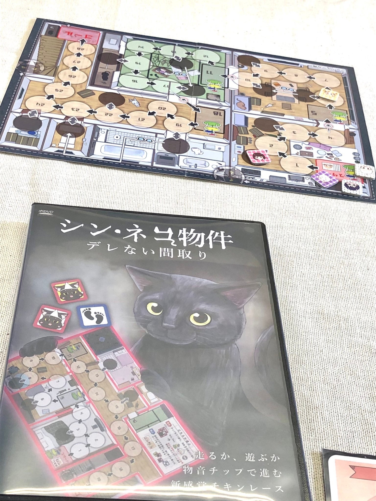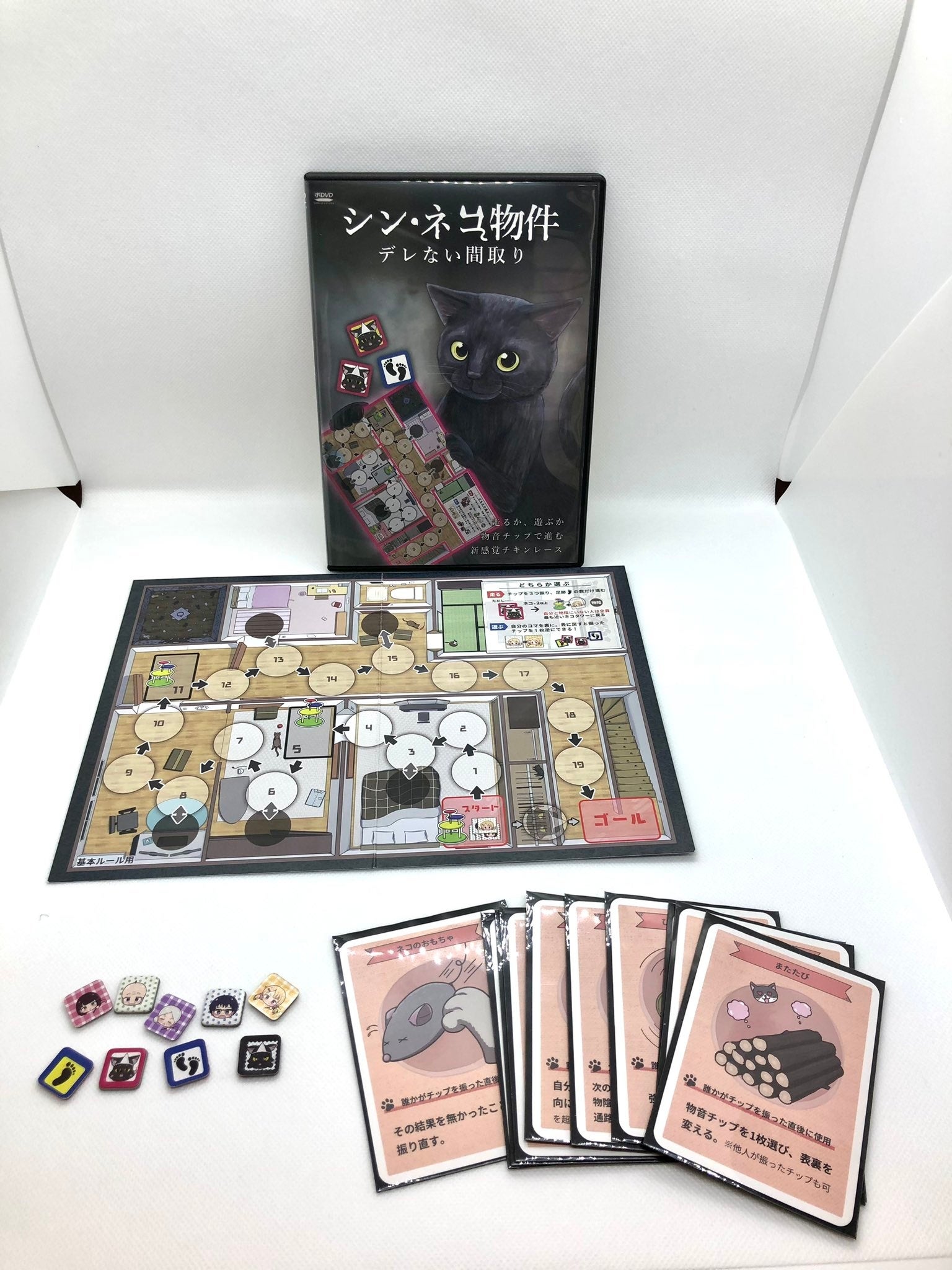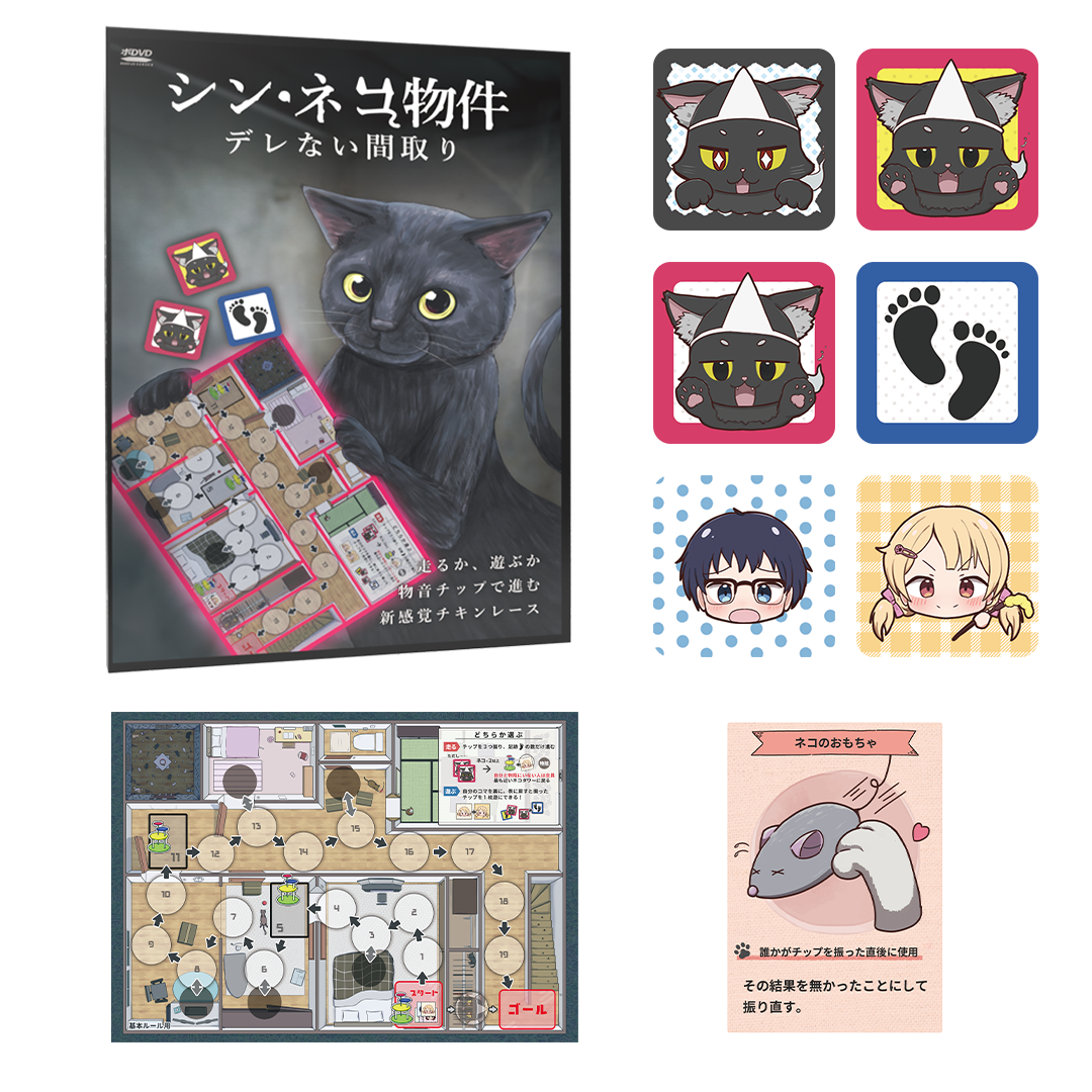 『シン・ネコ物件』はチキンレースすごろくゲームです。すごろくゲームですが、サイコロを振るのではなく3枚の「物音チップ」を振ってその表裏の組み合わせによって結果が変わります。