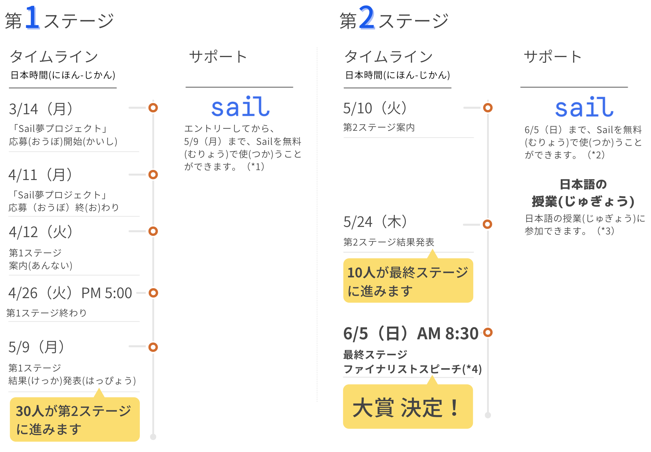 国内外の豪華なゲストや審査員を招待し、入賞者は日本への招待や日本企業でのインターンシップの機会等を提供いたします。約1ヶ月半という期間の中で日本での就職や留学を目指す世界Sailerたちを日本全国の多種多様な経験を持つ日本Sailerが全力サポート。Sailを通じて日本文化や日本語を学ぶきっかけ、日本語を使う仕事、日本で働く一歩となるきっかけを提供いたします。