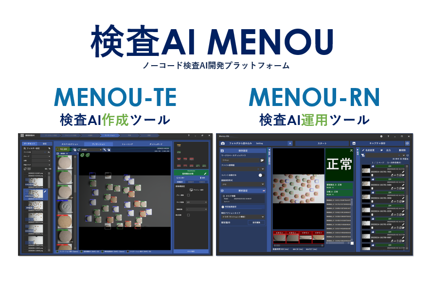 MENOUの提供する検査AI ( https://menou.co.jp/menou-te ) は、外観検査のための複雑な検査・検品・点検ソフトウェアをプログラミングすることなく、ノーコードで開発することができます。