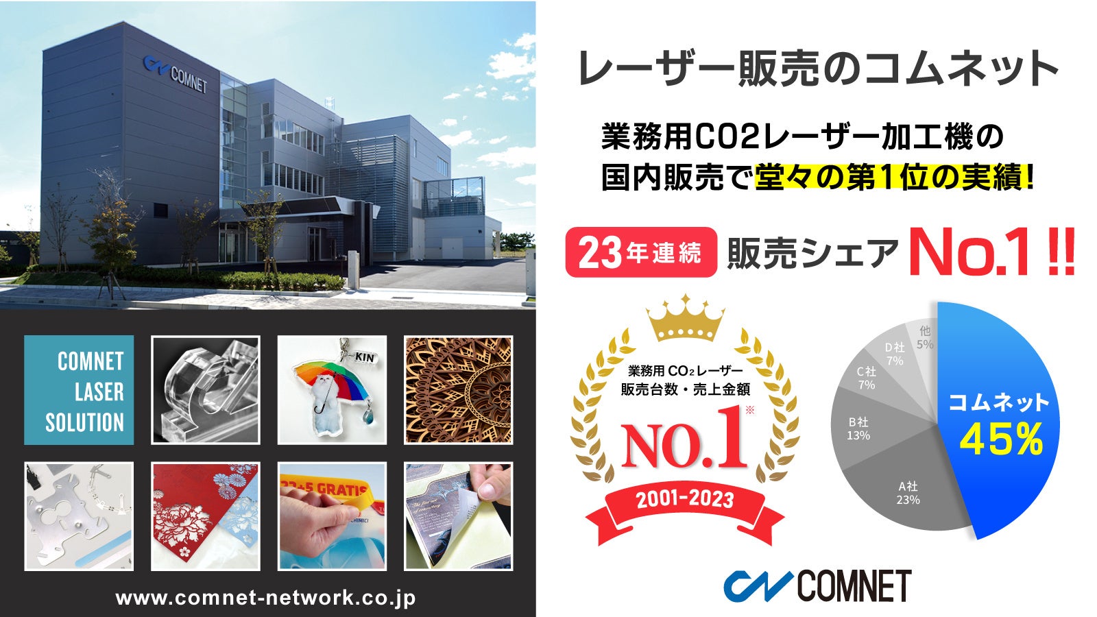 業務用CO2レーザーを取り扱っている販売会社は当社以外に国内に12社(メーカーは5社)ありますが、当社の販売実績数は、業界トータル販売数の約45%のシェアを獲得し、年間販売台数・売上金額も調査を始めた2001年~現在に至るまでの間、業界内で23年連続で堂々の第1位の実績を誇ります。