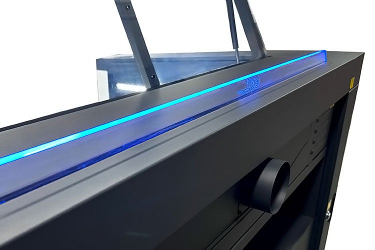 新構造のカッティングテーブルにより、レーザーカットによる溶け幅を盤面全体で調整可能。大口径の吸引口で加工物への煙の付着を軽減。