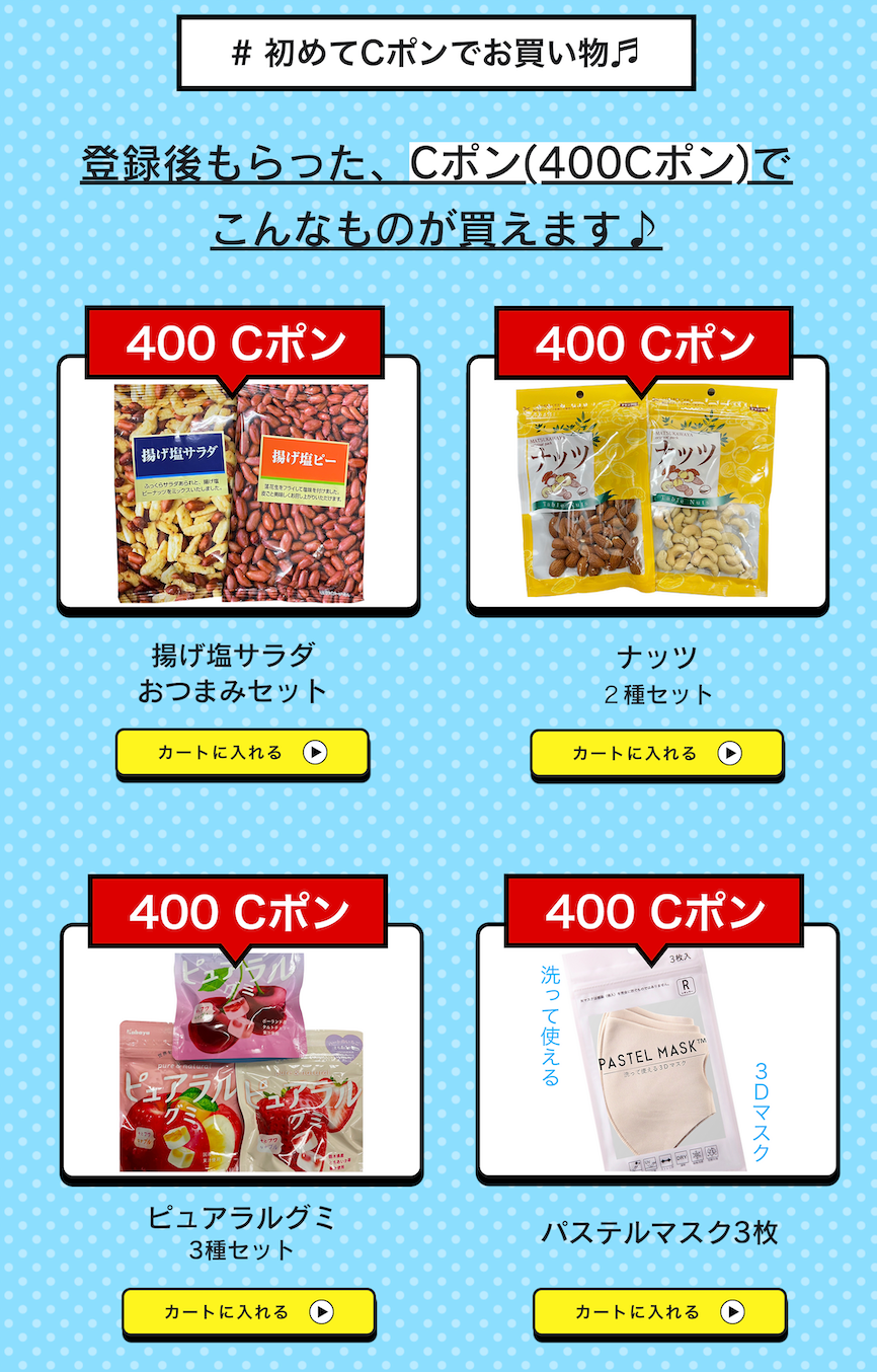 現在、Cポンを新規登録すると500円分のポイントが付与されます。「初めてCポンでお買い物ンキャンペーン」では、その500円分のポイントで買える商品をピックアップしています。まだCポンを使用したことがない方にもお得にご利用して頂く事が可能です。