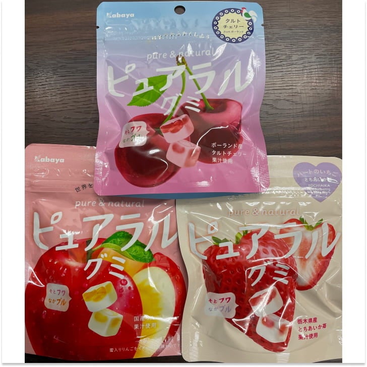 そとフワ、なかプルのやわらか食感が特長のグミです。 本物の果実をかじったようなフレッシュな香りと蜜入りりんごのような甘酸っぱい味わいです。国産果汁を使用。 果汁量がアップしました。
