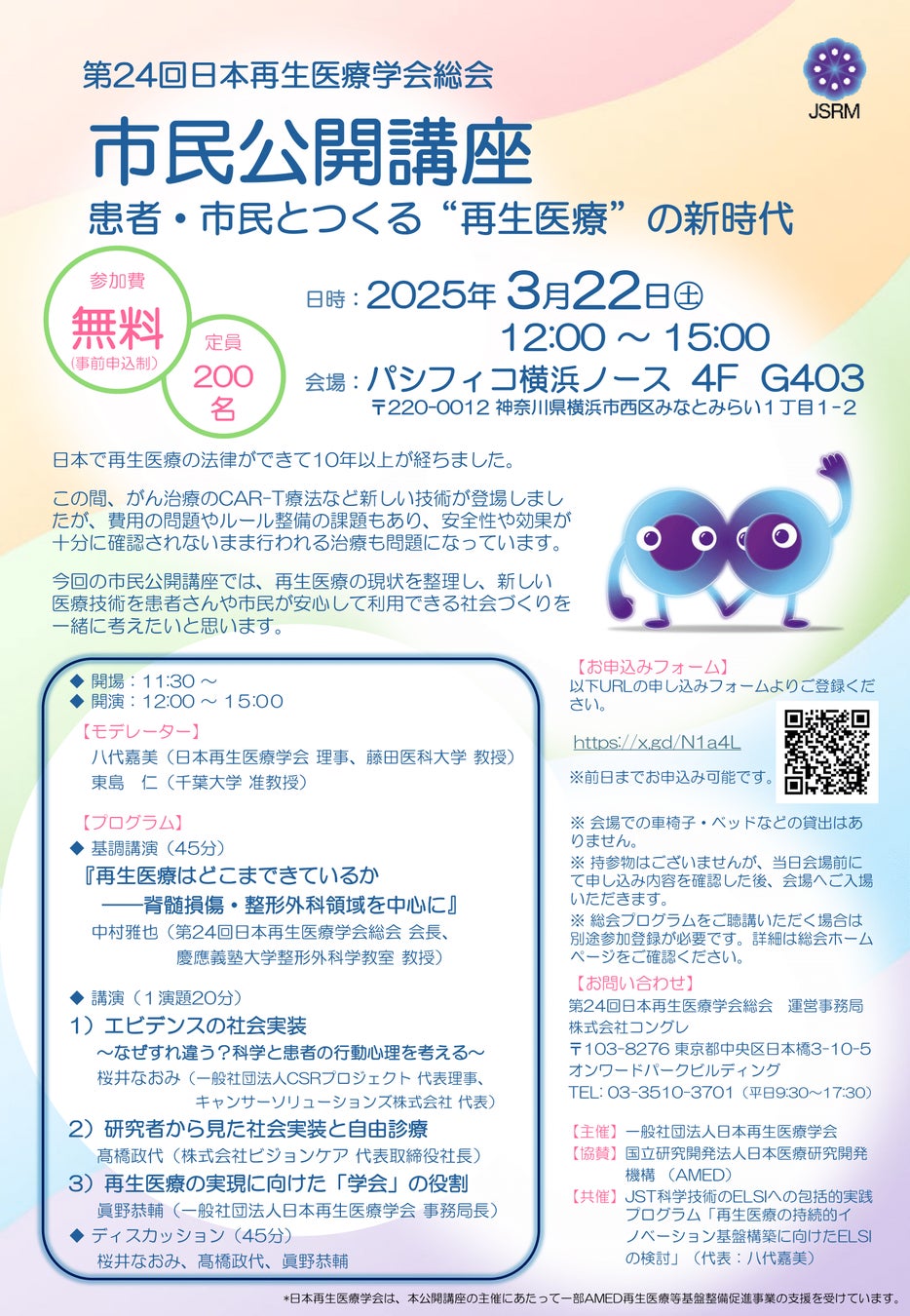「Passion, Vision, Action ―実学としての再生医療―」をテーマとした 第24回日本再生医療学会総会(横浜)の3日目に【市民公開講座】を開催いたします。どなたでもお申込できますので、治療を考えている人だけでなく、再生医療に関心があるなど幅広い人に耳を傾けていただけたらと思います。そして、再生医療をより身近な存在とする第一歩にしたいと考えております。みなさんのご参加を心よりお待ちしております。