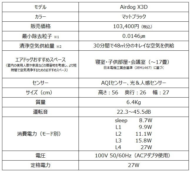 ※1 【試験機関】National Center of Quality Supervision and Inspection and Testing for Air Conditioning Equipment【報告書番号】NCSA-2019A-0076【試験方法】30㎥の試験空間で、Airdog稼働時の除去効率と自然減衰率を比較【試験対象】粒子状物質(14.6nm、51.4nm、101.8nm)【試験結果】0.0146μmの粒子を30分で99.9%以上除去※2 キレイな空気とは、試験対象物質(タバコ煙粒子)を含まない清浄空気のことであり、清浄空気供給量は、AHAM規格により外部機関(PSB Singapore)で試験して得られたCADR値に基づいた数値より算出した清浄空気の供給量を示す。部屋の高さを2.4mとして算出