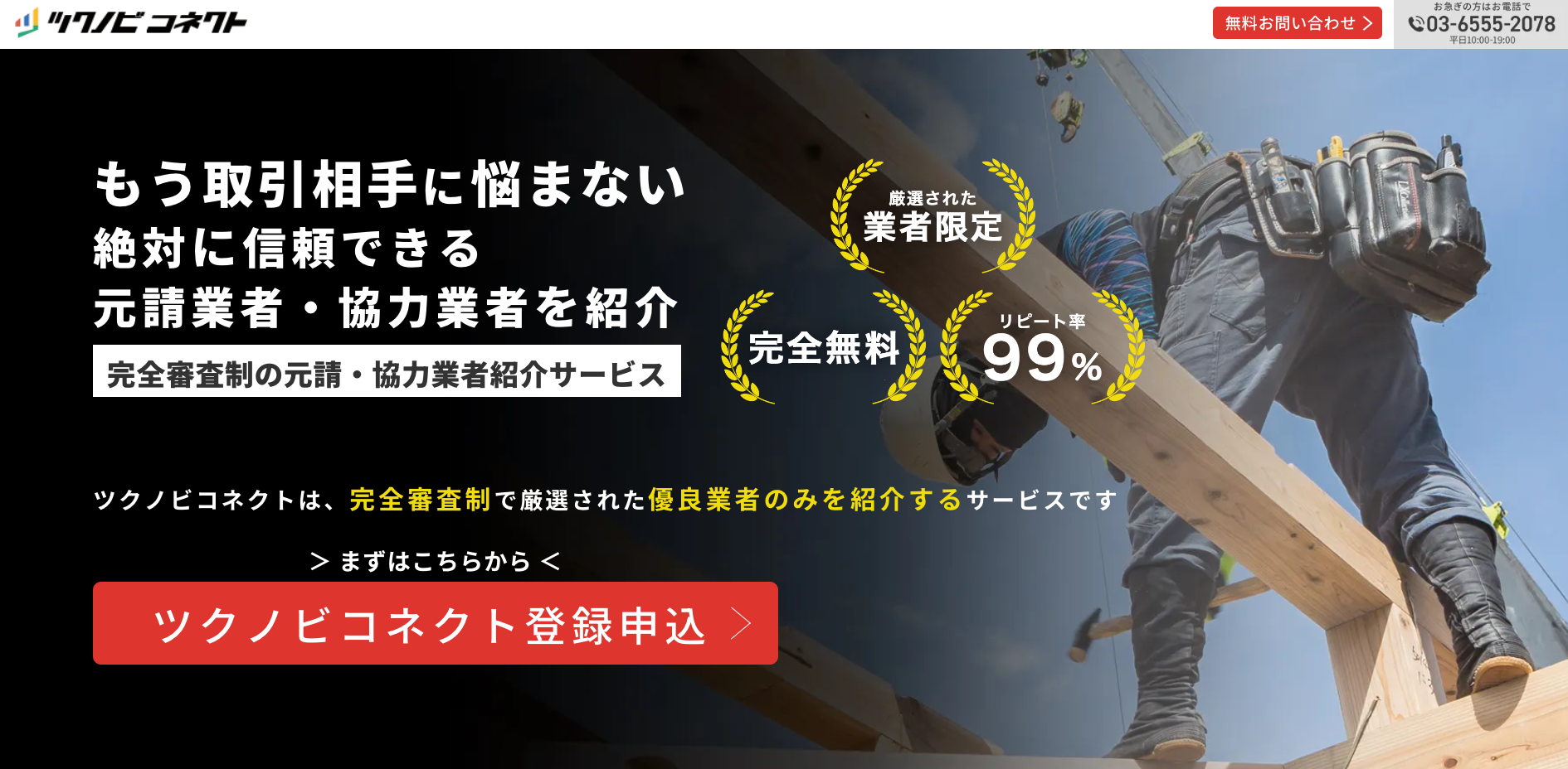 ツクノビコネクトは完全無料、完全審査制で厳選された優良業者のみを紹介するサービスです。本当に信頼できる業者のみが集まるネットワーク内で受発注を行います。