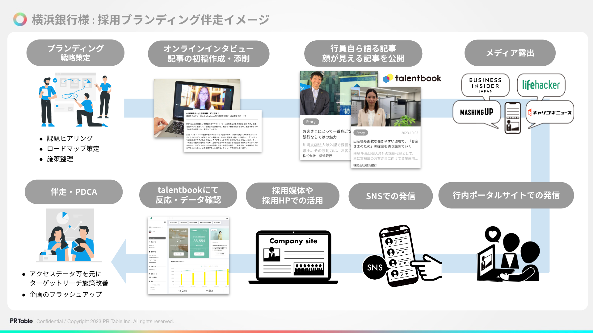 『talentbook』は、「働く人」から企業の魅力を伝える採用ブランディングサービスです。企業の魅力と求職者のイメージギャップを埋めるための採用戦略をプランニングし、コンテンツの企画から、つくる、届けるを通してリーチ量や滞在時間、アクションデータを蓄積。PDCAを回しながら企業に最適化したデジタルPR施策をワンストップで提供します。