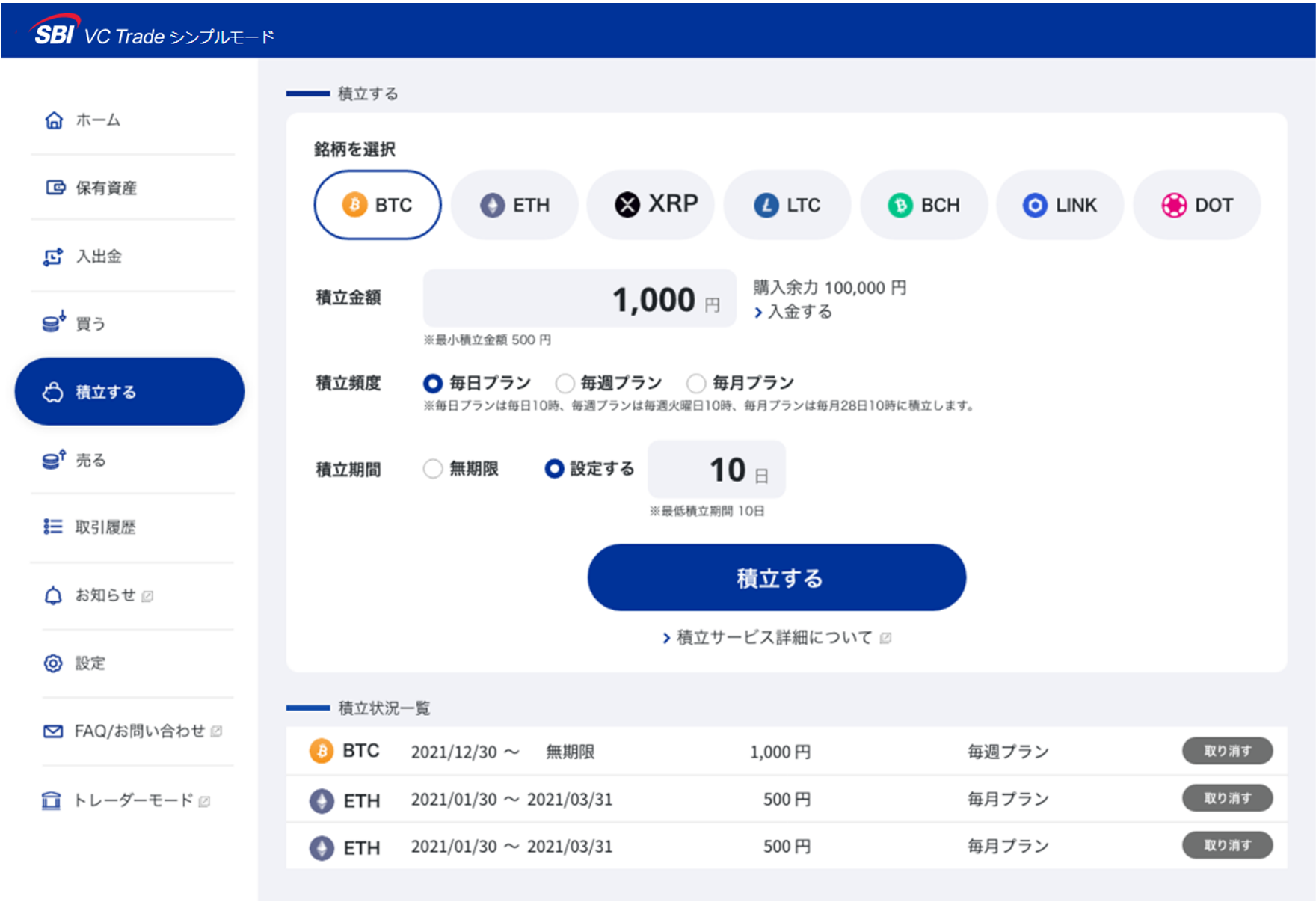 シンプルモードは、暗号資産現物のお取引でご利用いただけます。直感的な操作のしやすい、シンプルな画面構成となっており、はじめて暗号資産取引を行う方にも使いやすいデザインとなっております。