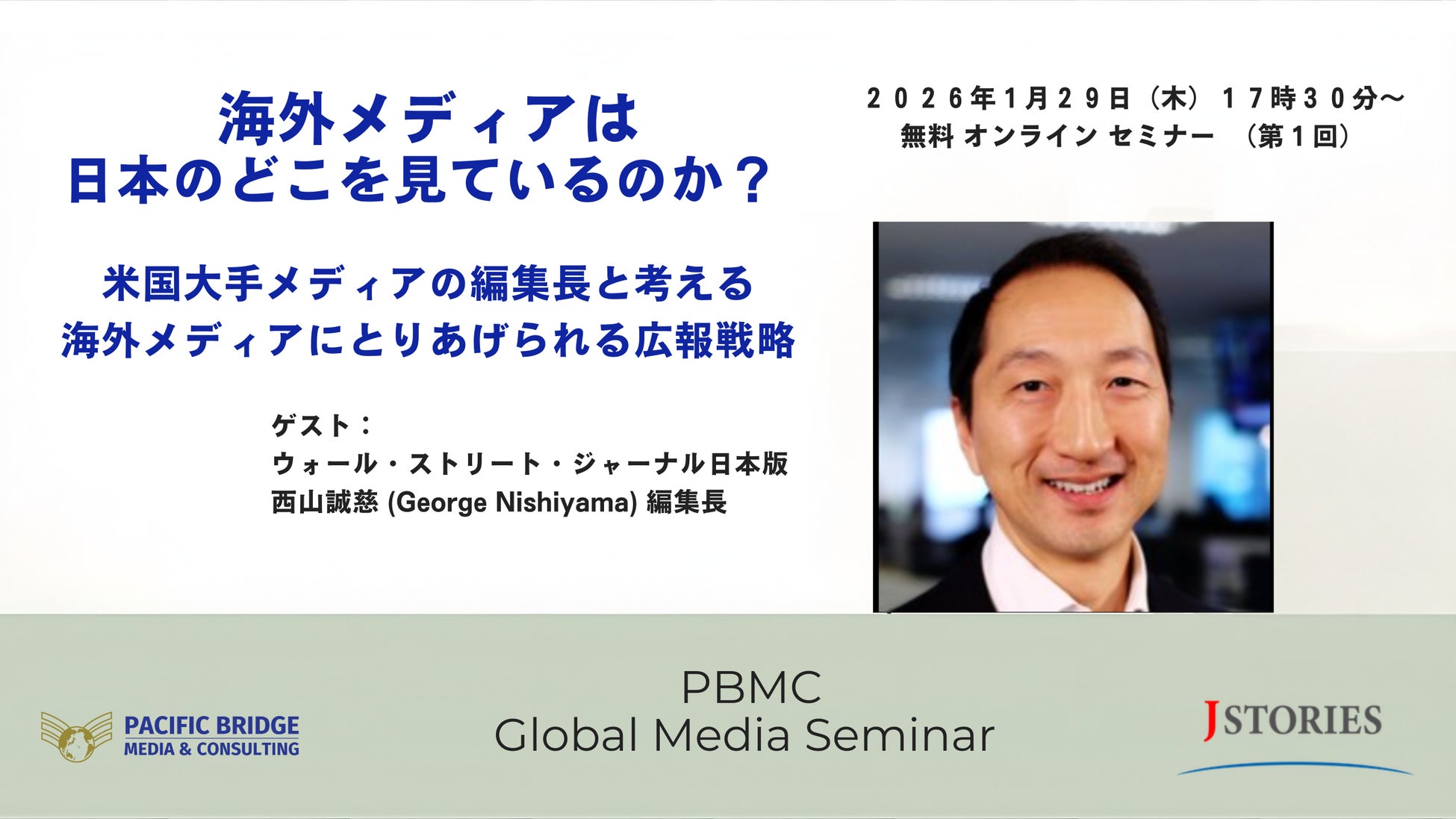 Pacific Bridge Media and Consulting, Inc.(以下、PBMC、本社:東京都)は、毎回世界のメディアやニュース機関の第一線で活躍する専門家をお招きし、海外メディアの特性を理解しながらグローバルメディアと企業PR関係者との接点を探る無料のオンラインメディアセミナー(第一回)を1月29日に開催します。