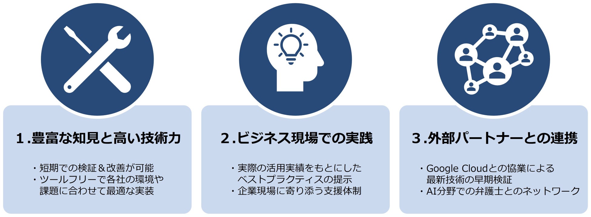 技術革新や法的規制など当面は激しい変化が続くことが見込まれる生成AI分野において、攻めと守りの両輪から、企業にとって持続的に成果を創出する仕組みを提供してまいります。