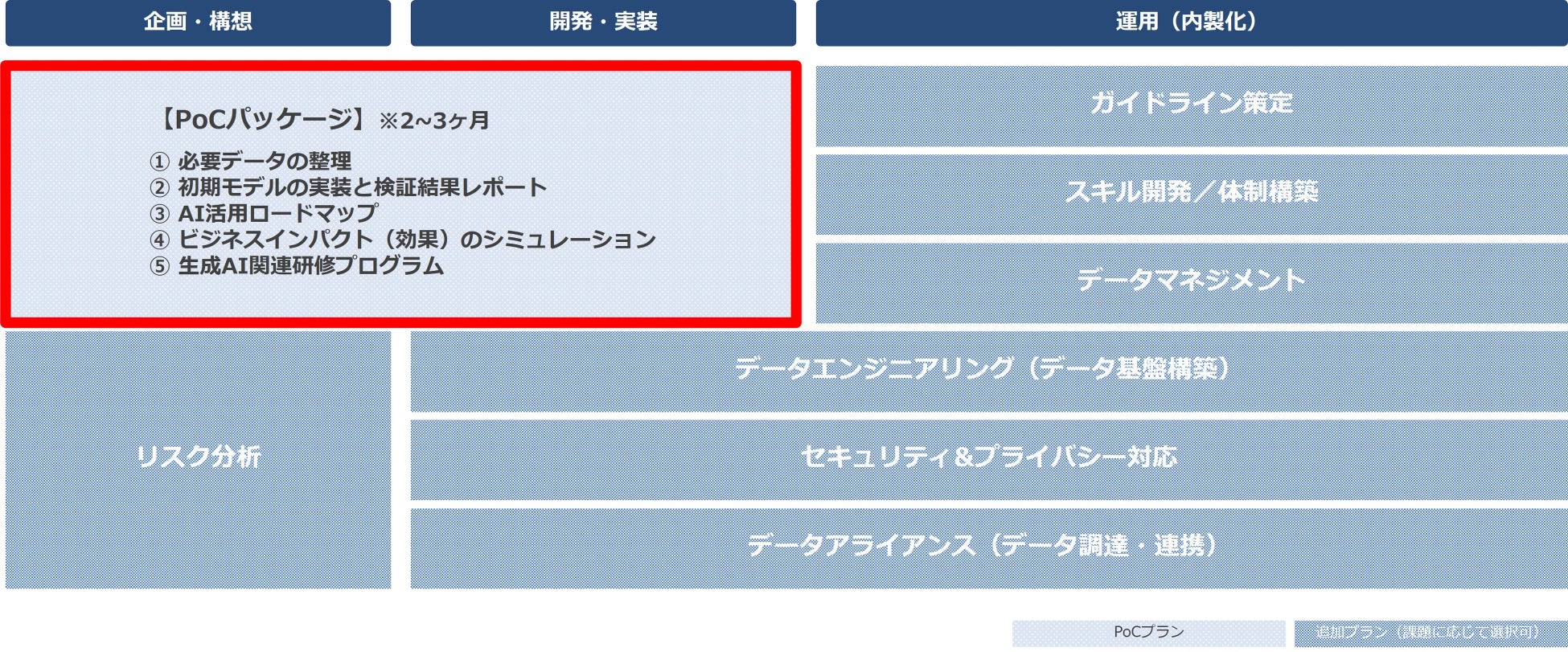 PoCを通じた企業側での人材育成や体制整備を兼ねているため、早く推進したいが何から着手すべきかわからないという場合には本パッケージを是非ご活用ください。