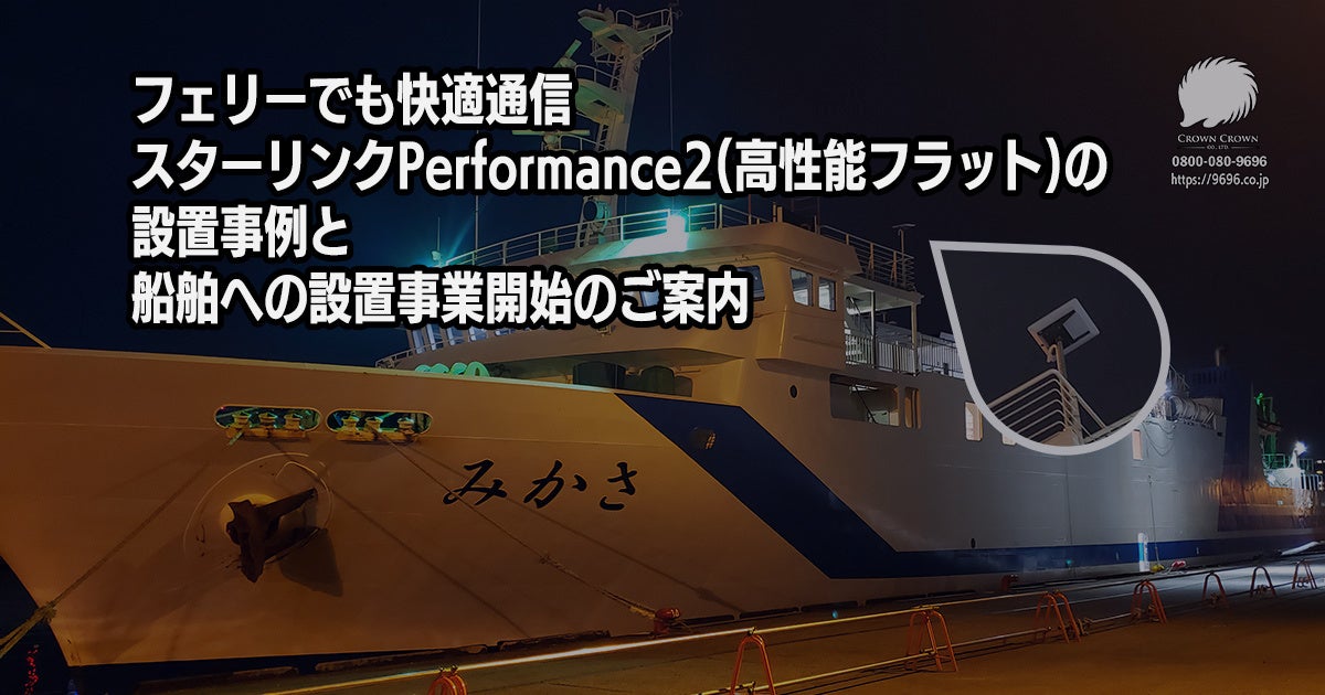そのクラウンクラウンが今回、壱岐・対馬フェリー株式会社が運航するフェリー「みかさ」に、衛星インターネット「スターリンク(Starlink)」の高性能モデル「Performance2」(旧名称:Flat High Performance|高性能フラット)を設置しました。