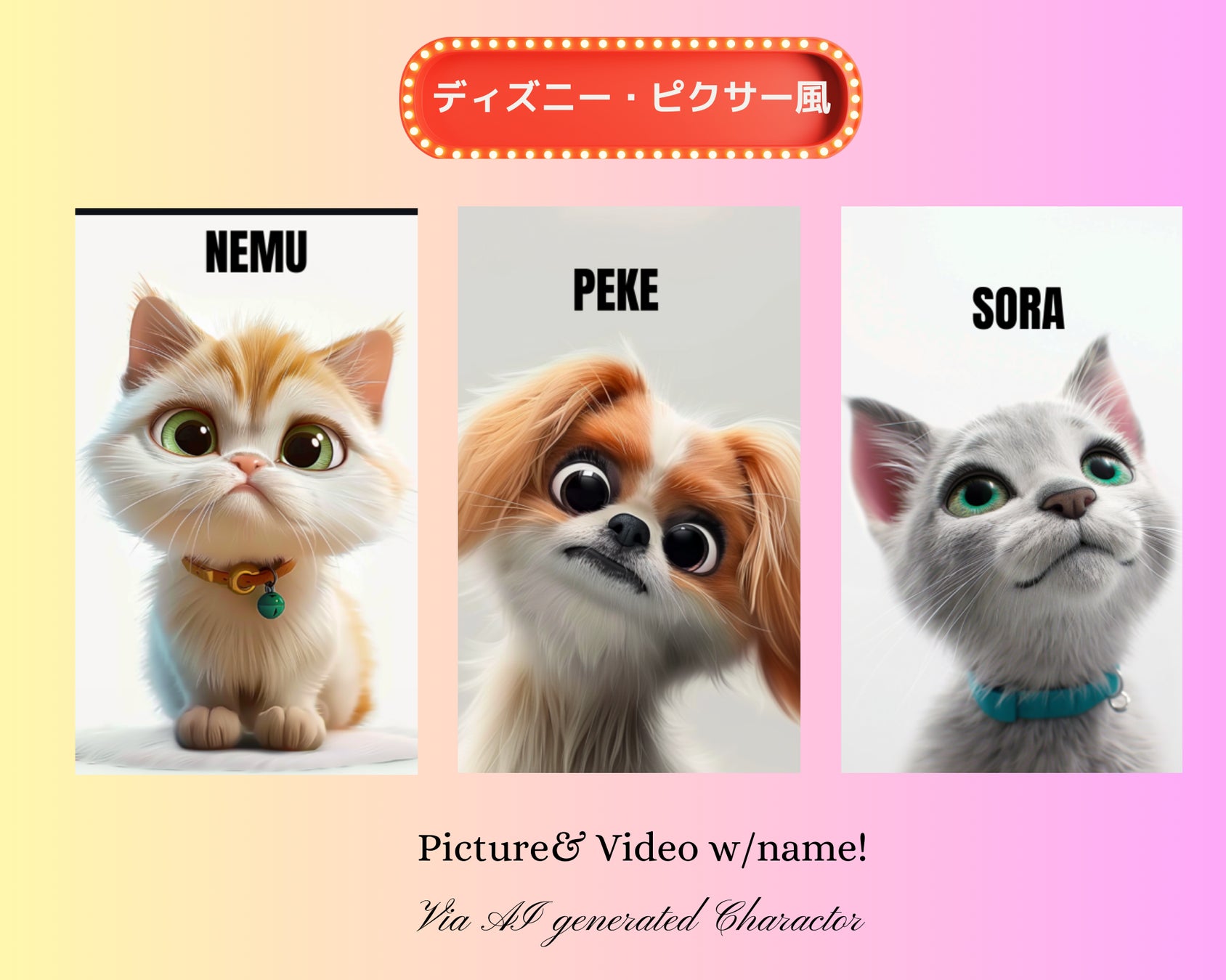 ペットのキャラクター化は、人工知能(AI)技術を使い、ショート動画を自動生成します。生成されたキャラクターは、プリントしたり、デジタルでも保存できるので、いつまでも一緒の思い出を形に残することができます。