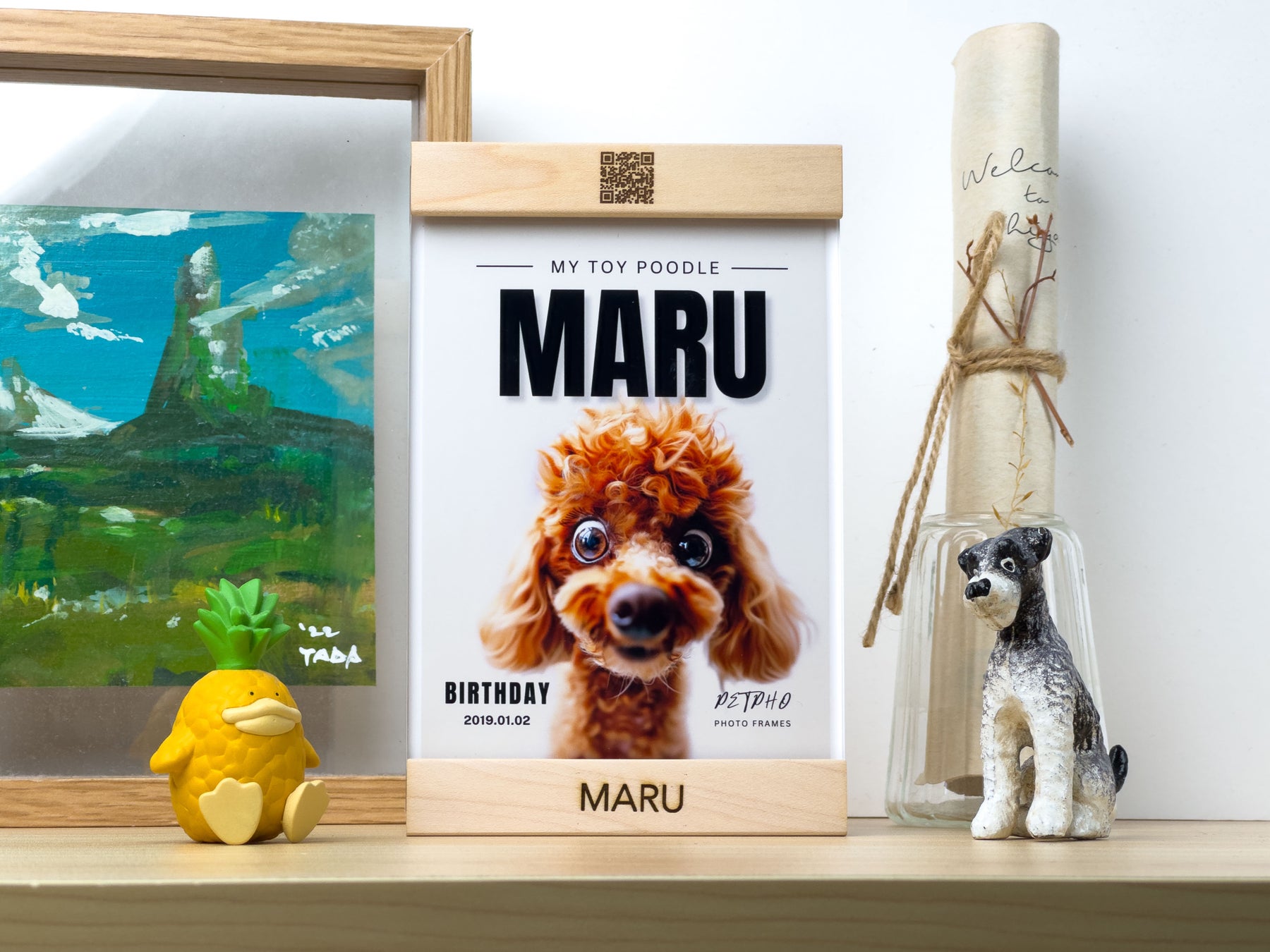 ペットのお気に入りの写真を選び、QRコードからアップロードするだけで、お好みの自分のペットのキャラクター化したショート動画が生成されます。(写真立てのQRコード反映は3日程度かかります。)