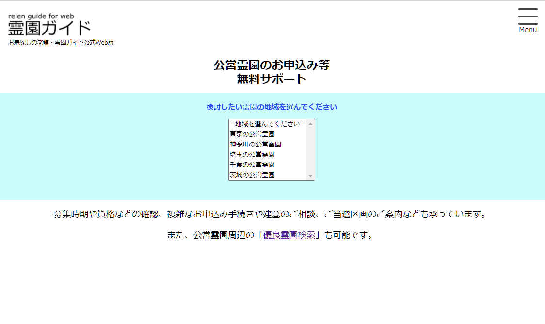 都立霊園や市営霊園などは居住や遺骨有など資格条件が合わなければ申込めないところが多いですが、お申込み手続きの確認などは煩雑です。そのご相談、ご当選区画のご案内、建墓のご相談、あるいは公営霊園以外の周辺の優良霊園検索も可能です。