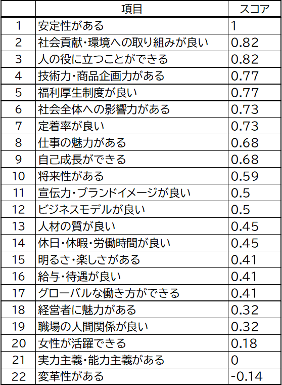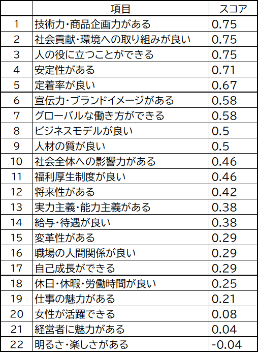 製造業にエントリーしなかった24名の上位5項目は、「技術力・商品企画力がある」0.75、「社会貢献・環境への取り組みが良い」0.75、「人の役に立つことできる」0.75、「安定性がある」0.71、「定着率が良い」0.67だった。製造業にエントリーはしなかったが、技術力や社会貢献度を認め、人の役に立てると考えていることがわかった。