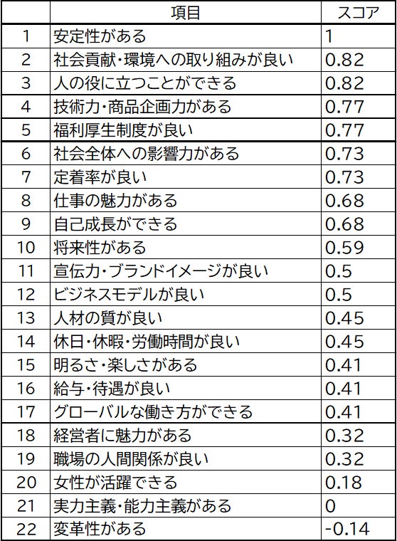 本調査では、マイナビ(2025)の「マイナビ2026年卒大学生業界イメージ調査<業界別>」を参考に、22項目(安定性がある、将来性がある、変革性がある、グローバルな働き方ができる、技術力・商品企画力がある、宣伝力・ブランドイメージがある、ビジネスモデルが良い、経営者に魅力がある、社会貢献・環境への取り組みが良い、社会全体への影響力がある、人の役に立つことできる、実力主義・能力主義がある、仕事の魅力がある、自己成長ができる、人材の質が良い、明るさ・楽しさがある、職場の人間関係が良い、給与・待遇が良い、休日・休暇・労働時間が良い、女性が活躍できる、福利厚生制度が良い、定着率が良い)について尋ねた。項目ごとに「そう思う」「どちらともいえない」「そう思わない」の三つの選択肢を設定した。回答をスコア化するにあたり、「そう思う」が1、「どちらともいえない」が0、「そう思わない」が-1で、スコア化を行い、項目ごとに平均値を算出した。