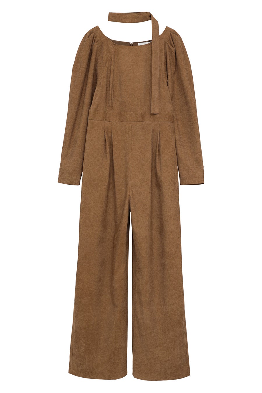 MINAMI TANAKA×CLANEコラボレーションのパフスリーブオールインワンです。みな実さんの「ホリデーシーズンに向けて、デコルテが綺麗に見えるオケージョンでも着られるオールインワンが欲しい」という思いから完成したアイテムです。高めの位置にボリュームを持たせた構築的なパフスリーブと、デコルテが綺麗にみえる衿ぐりがポイント。ウエスト切り替えを高めに設定し、スタイルが良く見えるバランスにこだわりました。肩線裏には下着の肩紐が見えないようショルダースナップが付いています。首元には同素材のチョーカーをあしらい、ボタンで取り外し可能です。繊細な細コーデュロイで、柔らかく落ち感のある素材を使用しています。