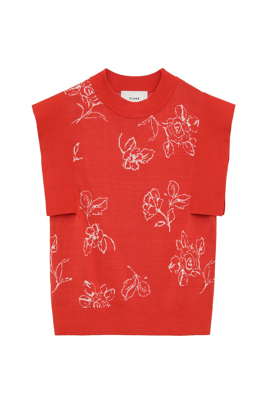 MINAMI TANAKA×CLANEコラボレーションのスクエアスリーブニットトップスです。CLANE定番のスクエアスリーブニットトップスの形に、オリジナルの花柄をジャガードで表現した1枚で映えるニットトップスです。線画で表現した花柄は甘くなりすぎず、モードで上品な印象で着て頂けます。素材は、上品なマット感のあるビスコース糸を使用し、程良い落ち感となめらかな肌触りが特徴です。同じシリーズのニットカーディガンとSETで着て頂くスタイルもおすすめです。