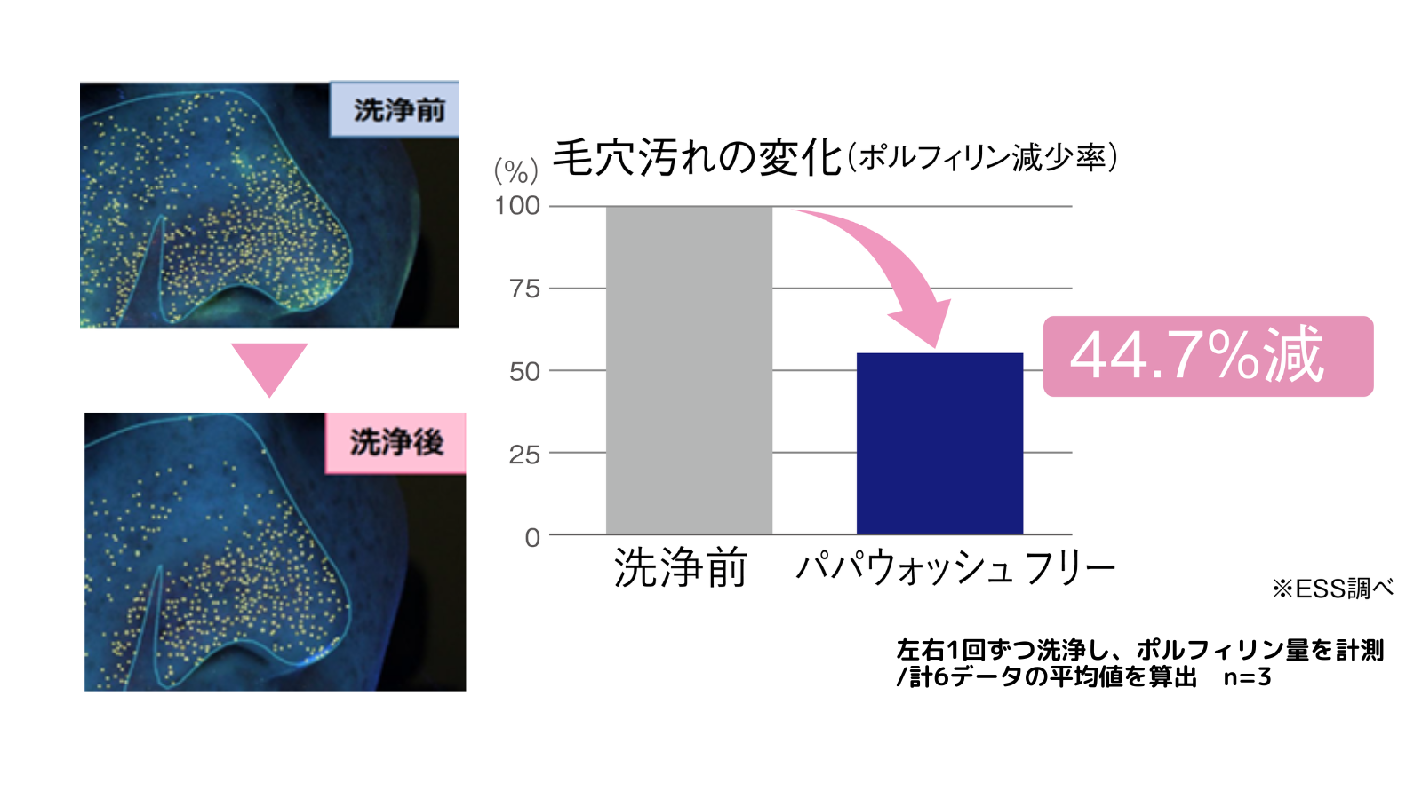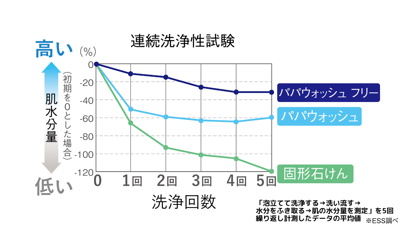 汚れ落ちを高めた一方で、既存のパパウォッシュに比べ洗顔後の水分量が高いという結果も。