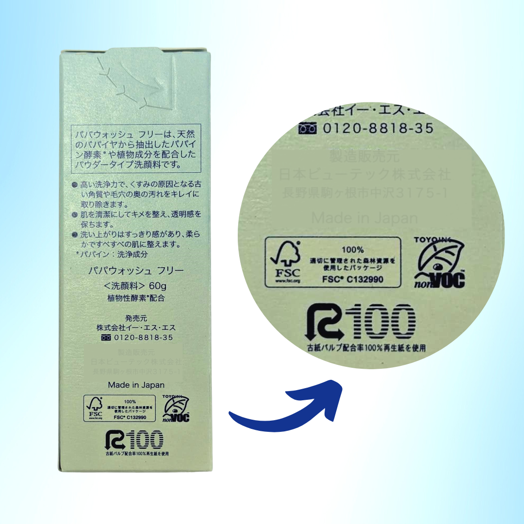 化粧箱には、100%FSC認証紙を利用した再生紙と植物由来99%以上のノンVOCインキを使用しています。